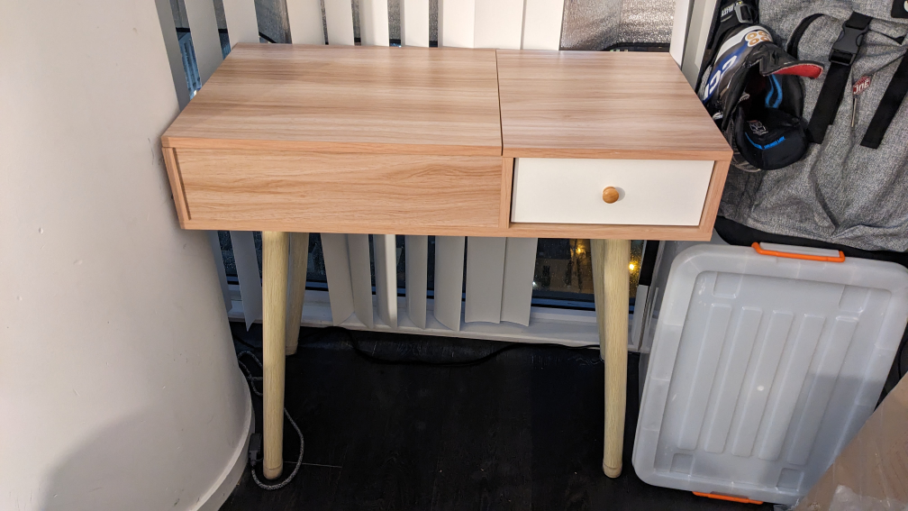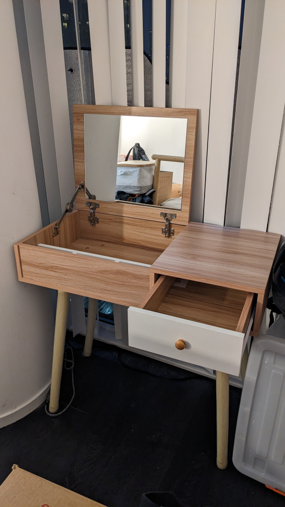 73Bought from Wayfair, original price like $300, almost perfect condition. Widest length (desk): 41cm Widest width (desk): 80cm Overall height (mirror closed): 75cm (desk height 15cm, desk bottom to ground 60cm), mirror opened extra 34cm Yonge and Bloor pick up
