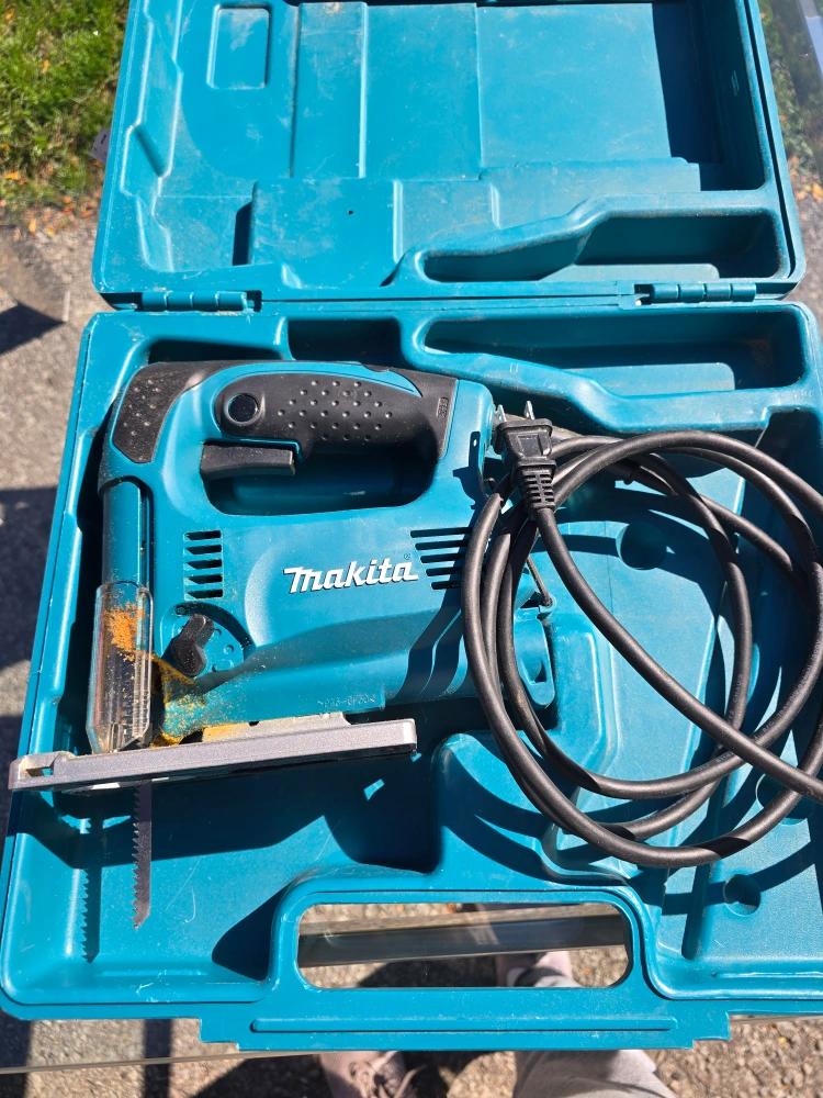 Selling a Makita 4329K Jig Saw. It comes in its original case! It's in good condition and ready for your next project Specs: Variable speed control dial (500-3,100 SPM) to match the speed to the application. Three orbital settings plus straight cutting for a more aggressive cut. Ergonomically designed rubberized grip for increased comfort and control. Counterweight balancing system engineered for reduced vibration. A through-the-body dust port and sliding dust cover for dust management.