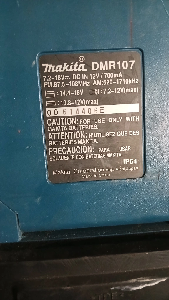 127Selling a Makita DMR107 job site radio. It's compatible with Makita batteries (7.2-18V). It also has FM and AM radio. It has an IP64 rating.