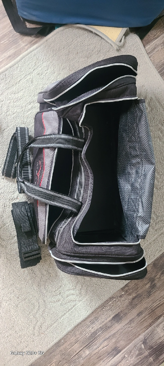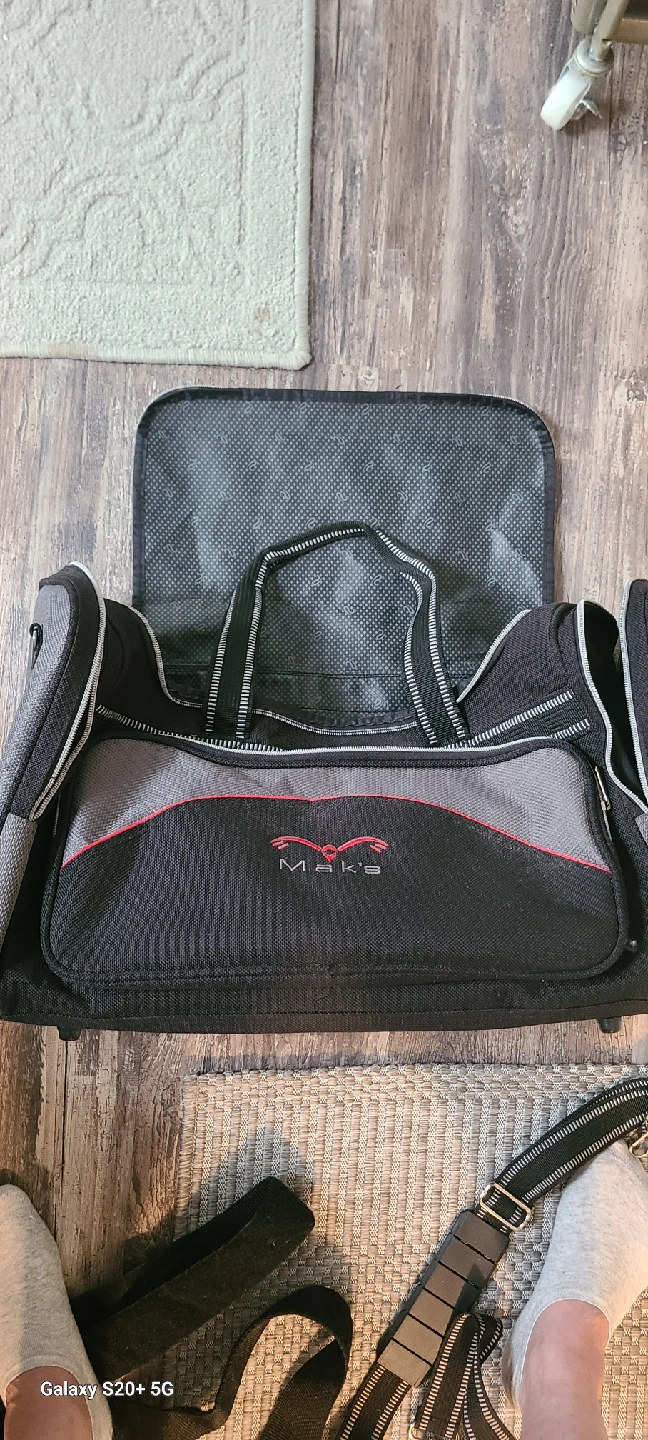 Here is a perfect MAKO duffle bag in black and grey. It features red accents and comes with two straps. It has multiple compartments. Perfect for sports or travel!