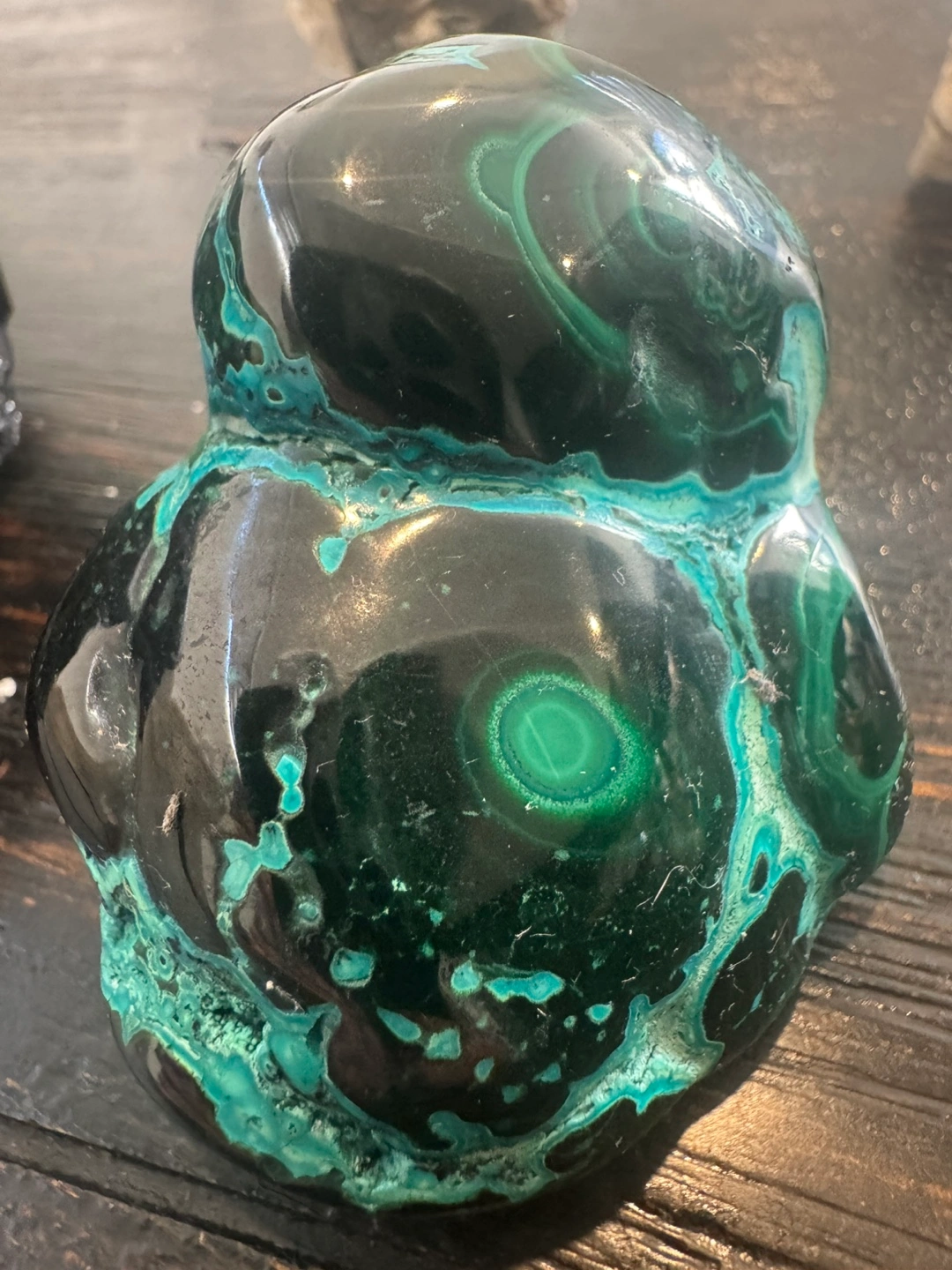 65Here's a beautiful malachite owl figurine! The green and black swirls are very striking, and it would make a great addition to any collection or a unique decorative piece for your home