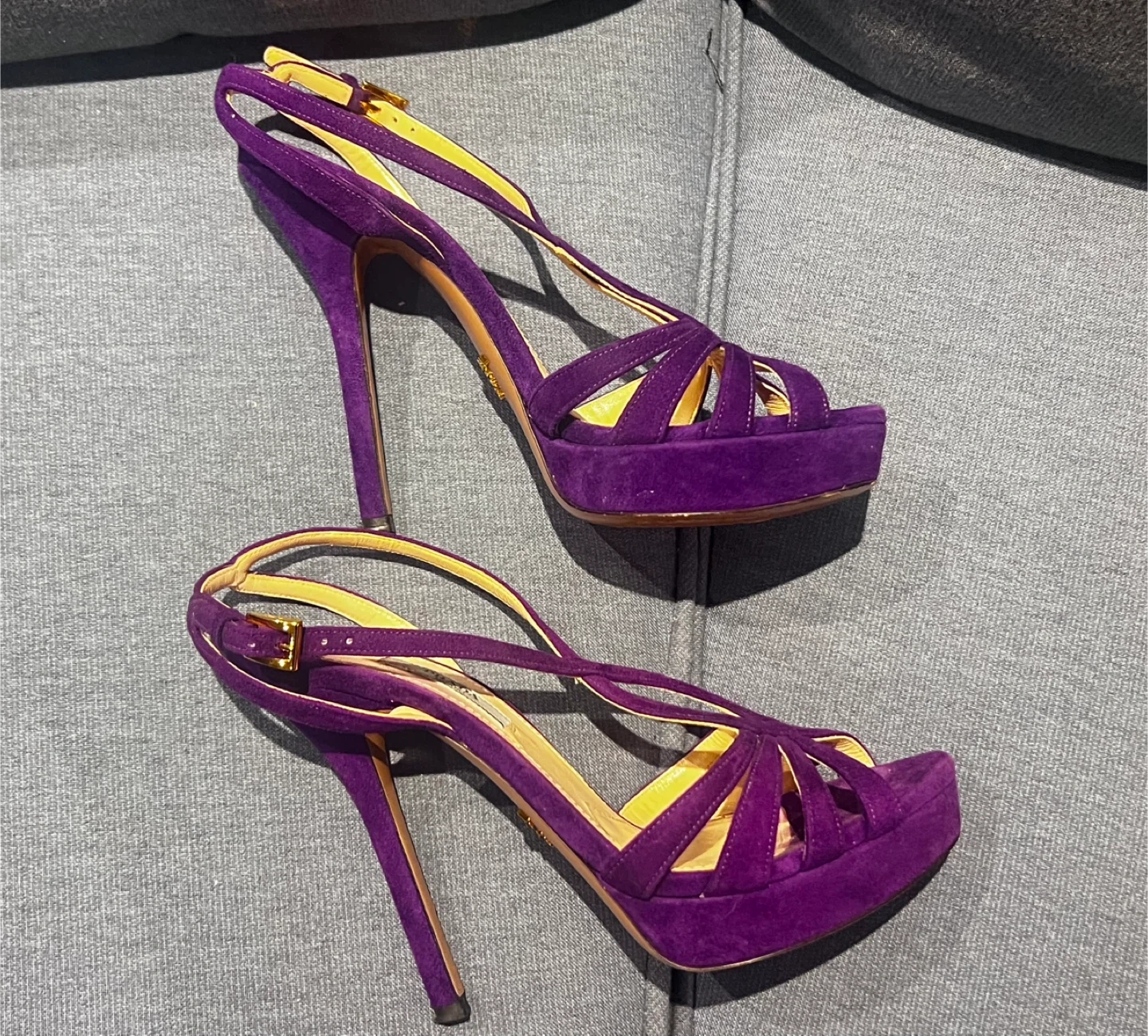 Prada heels are made from vibrant purple suede and feature a stylish platform. They have a delicate ankle strap with a buckle closure. The interior lining is a bright yellow.