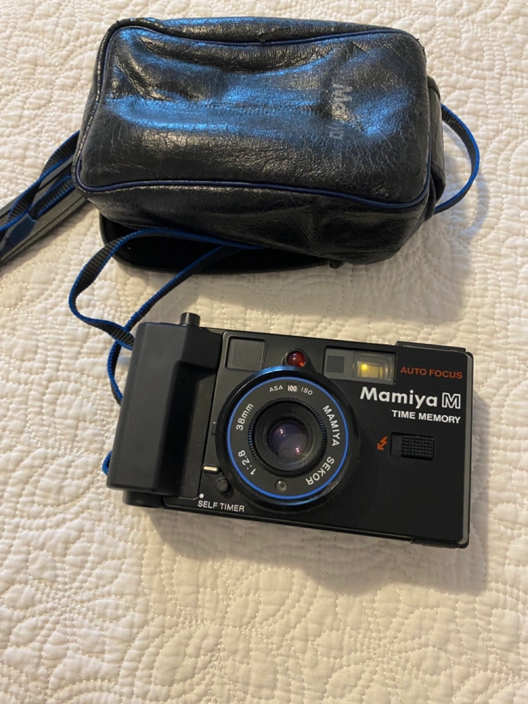 196Vintage Mamiya M 35mm film camera. Autofocus, time memory. Includes leather carrying case. 38mm lens.