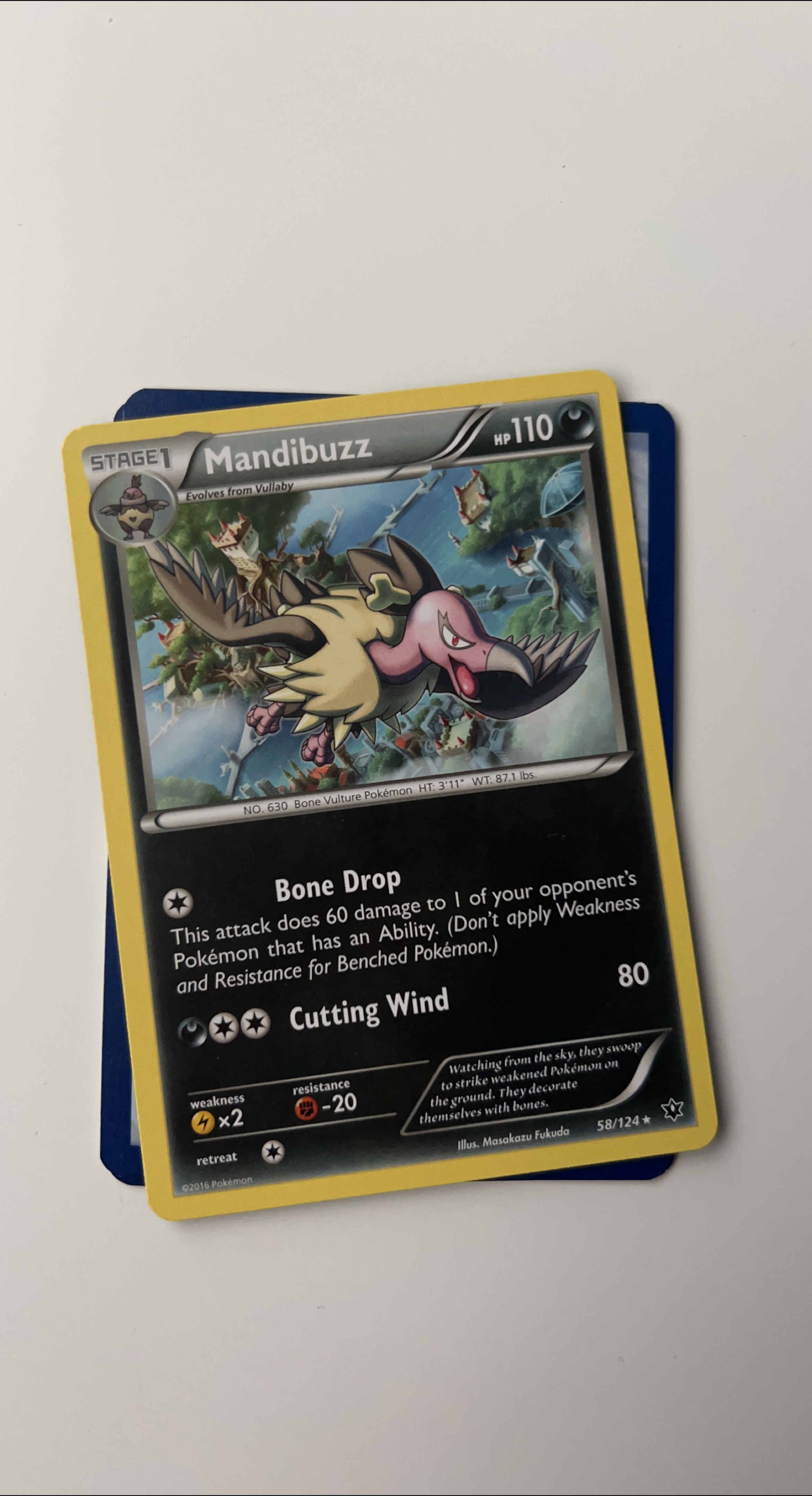 Selling a Mandibuzz Stage 1 Pokemon card! It evolves from Vullaby and has 110 HP. It features the Bone Drop attack, which does 60 damage, and the Cutting Wind attack. The card is from the 2016 Pokemon series and is numbered 58/124.