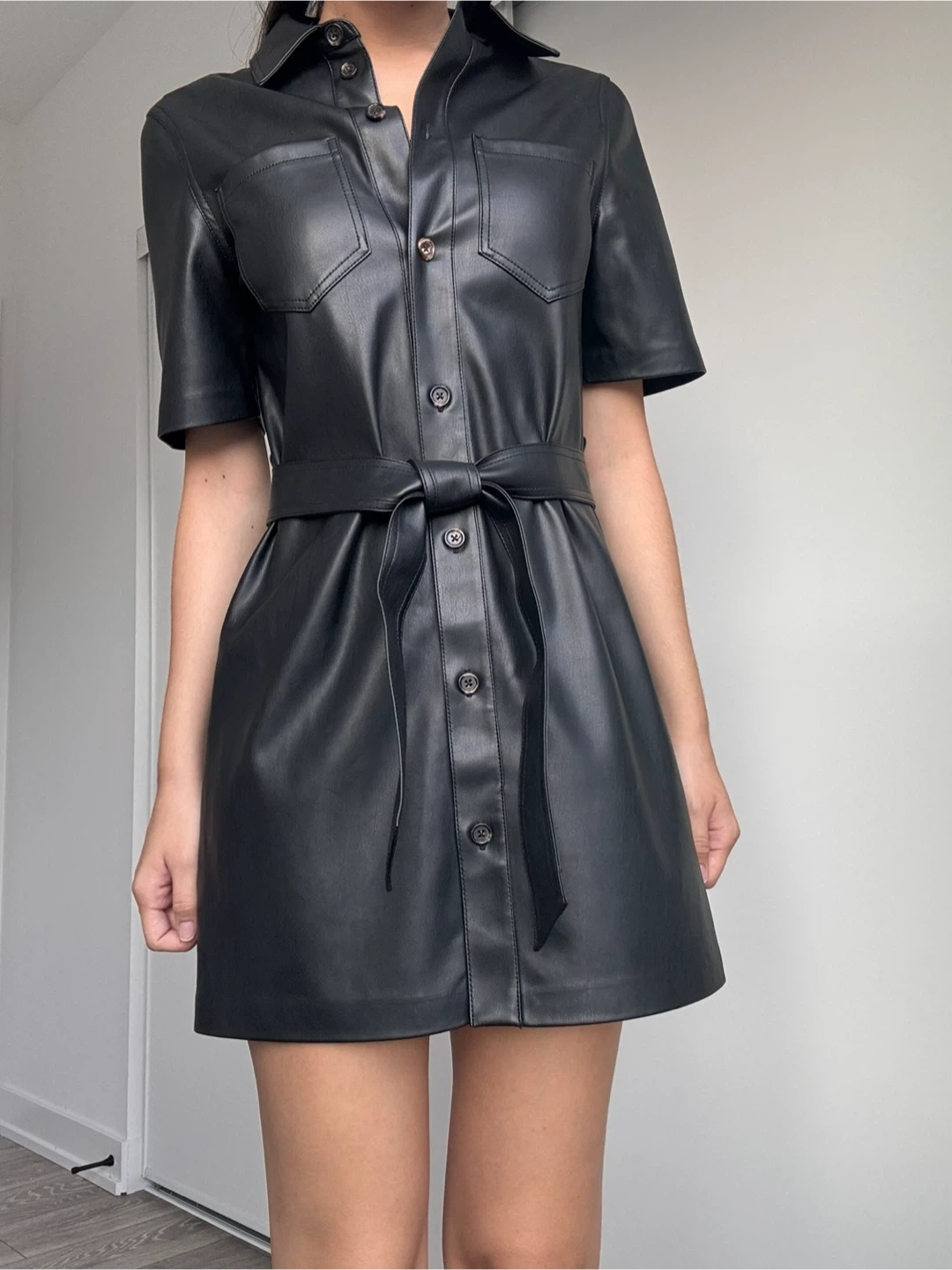 • Condition: Brand new, never worn • Color: Classic black • Style: Mini dress with a flattering silhouette • Brand: Mango • Material: 100% polyester (faux leather)