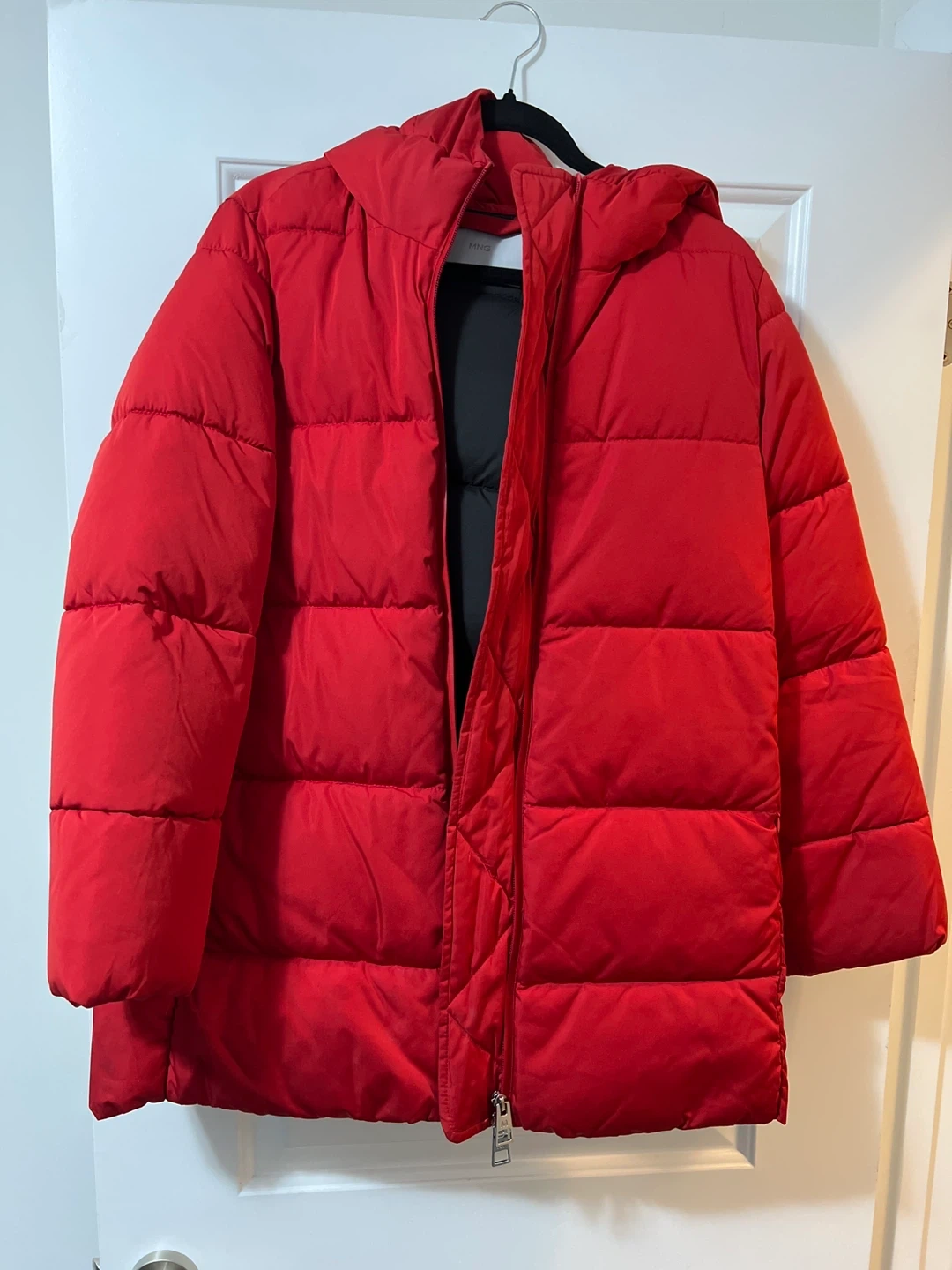 Selling a stylish red puffer jacket from Mango. It's a size XS and in great condition. Perfect for staying warm and cozy during the colder months. Comes with a hoodie as well.