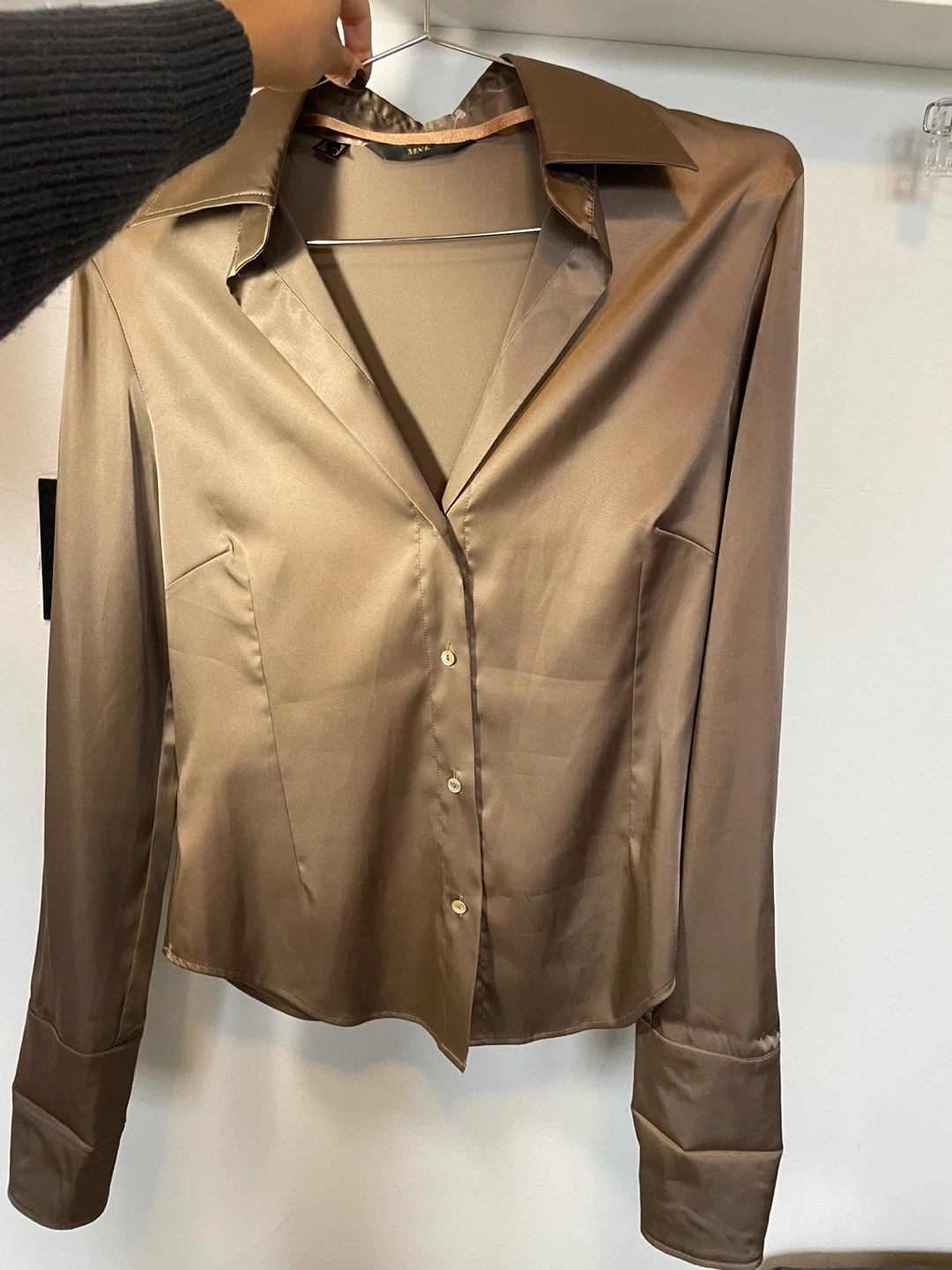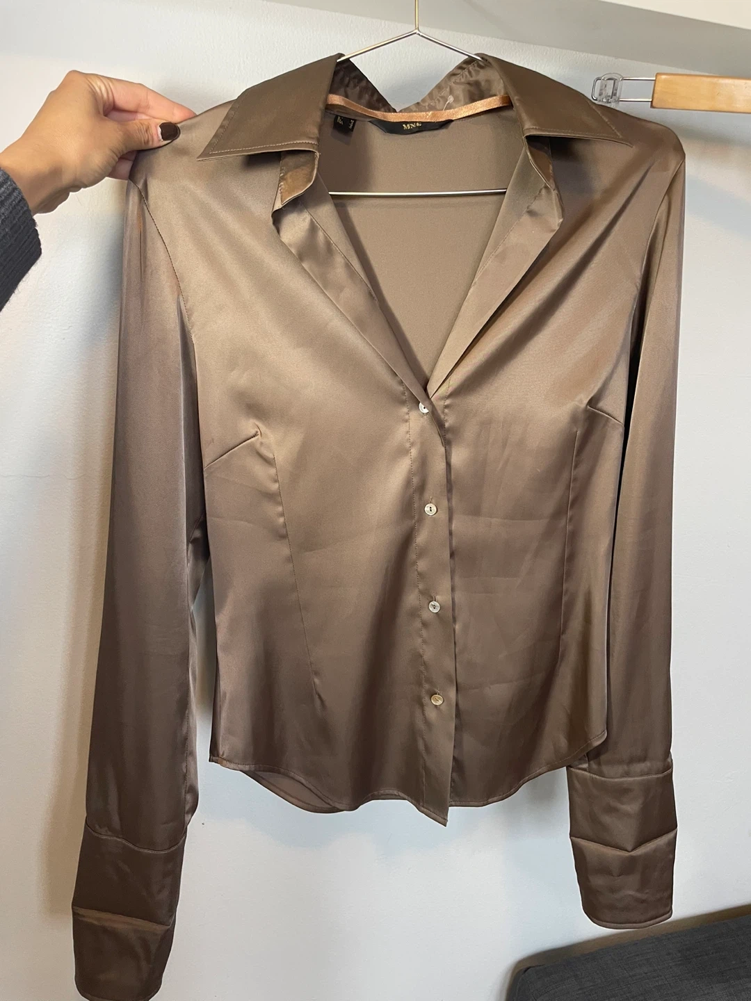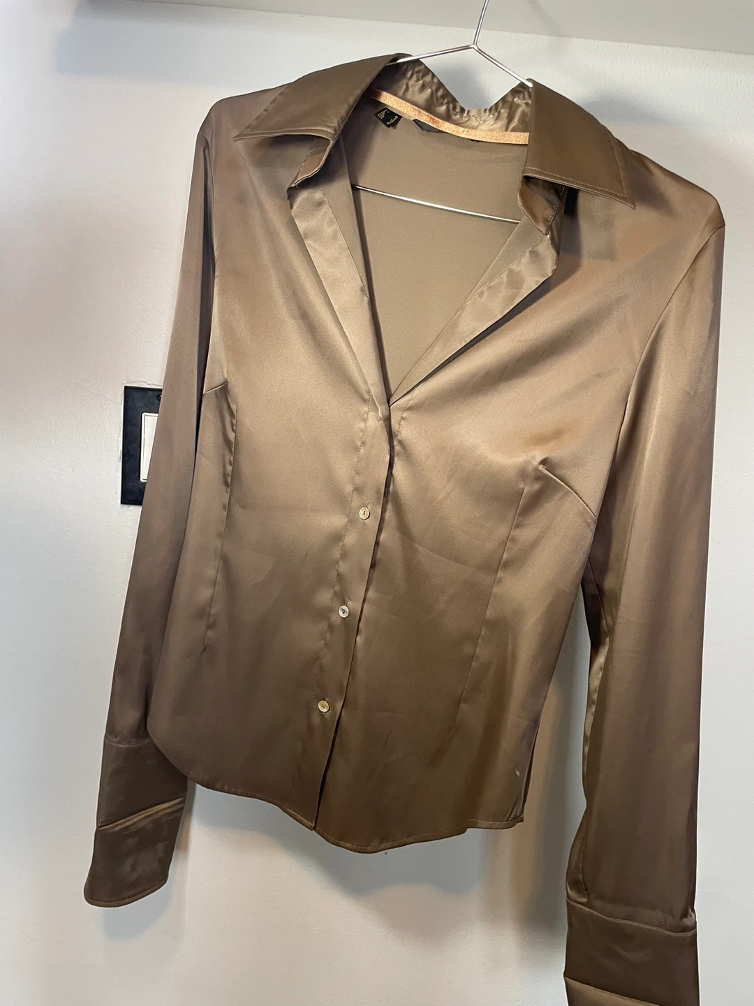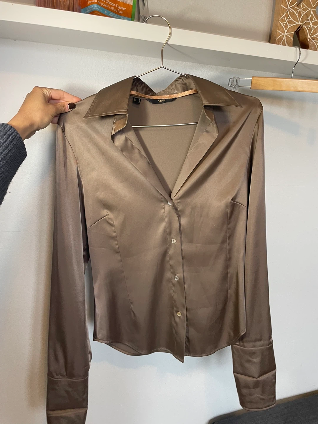 Here's a beautiful blouse in a lovely, shimmery silk blend. It's a size m in great condition! Perfect for dressing up or down. It's a stylish addition to any wardrobe! Pick up dufferin and st Clair
