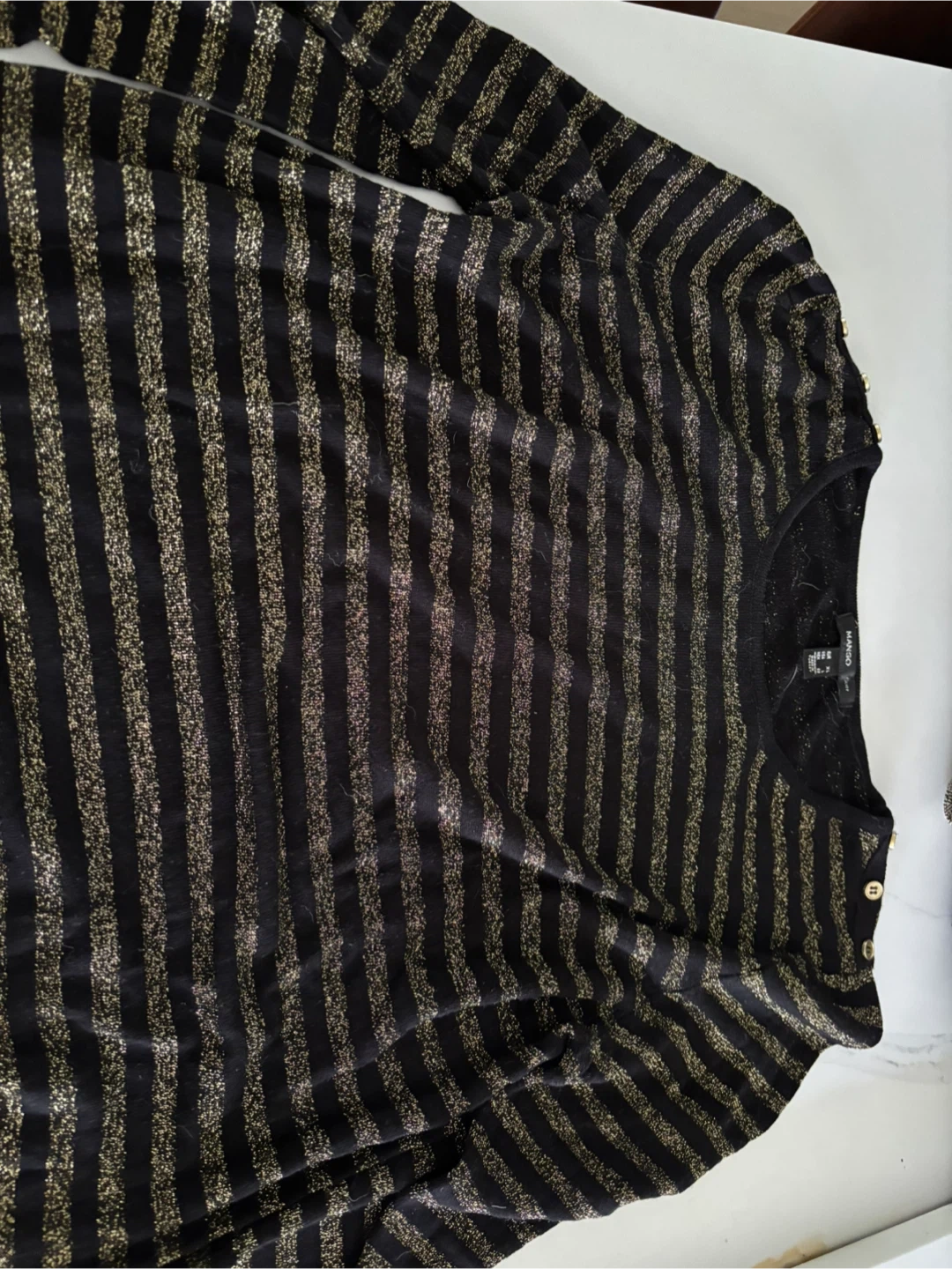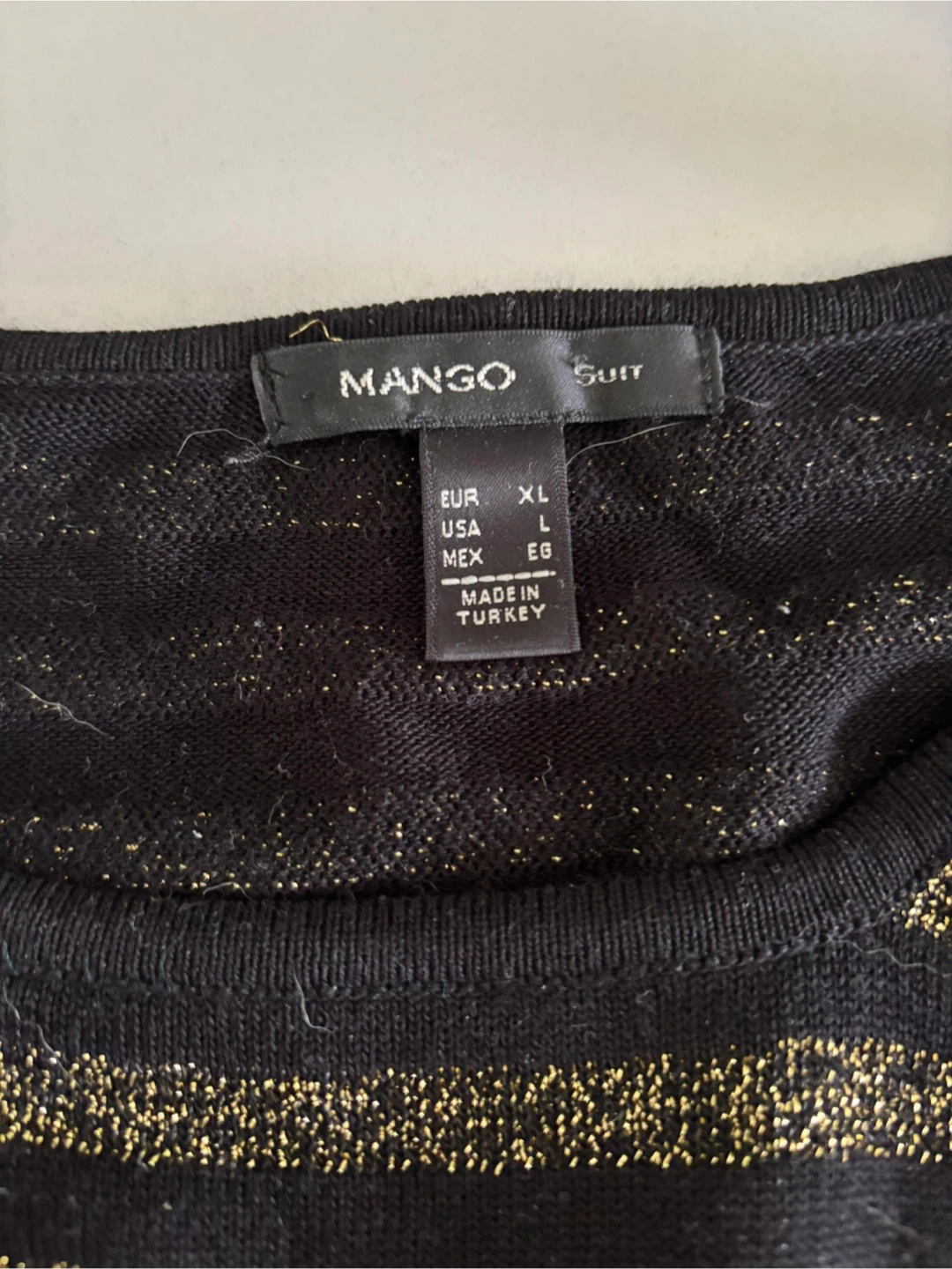 Selling a Mango Suit top in size L. It's a black top with gold stripes and button detailing on the shoulder. Perfect for adding a little sparkle to your wardrobe!