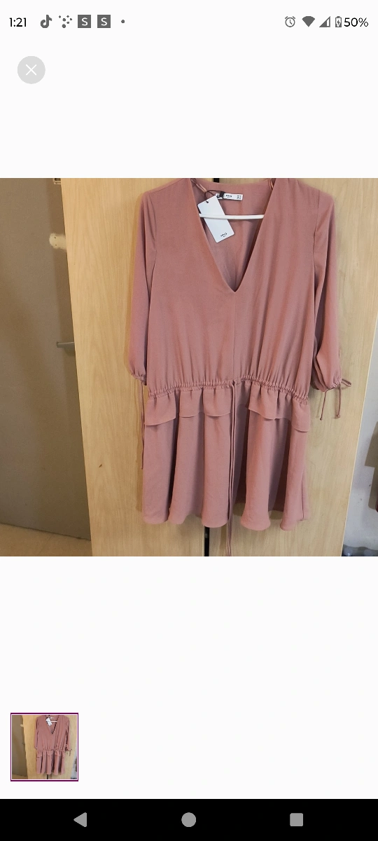 Dusty pink dress with a v-neck, 3/4 sleeves, and a ruffled bottom. Elastic waist with a tie at the front.