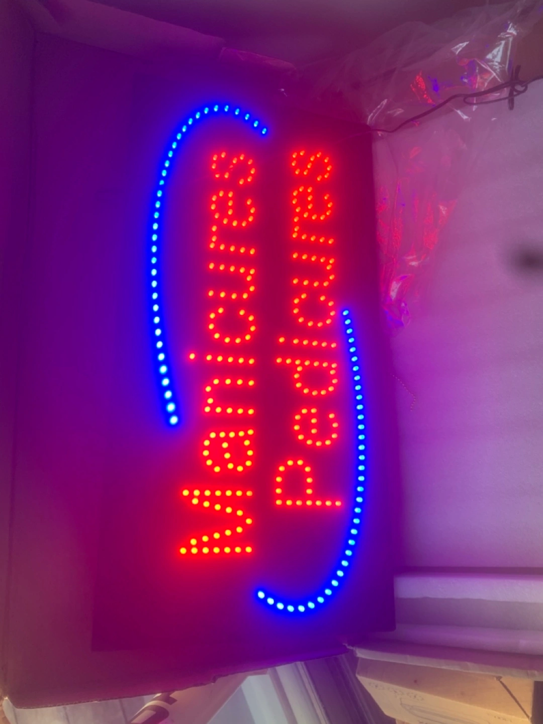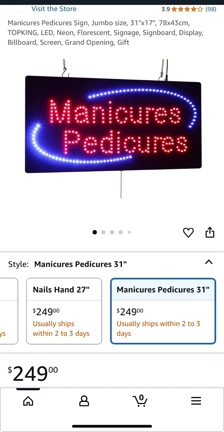 I'm selling a "Manicures Pedicures" LED sign. It's jumbo size, measuring 31" x 17" (78x43cm). This sign is perfect for a salon or spa, adding a bright and inviting touch to your business