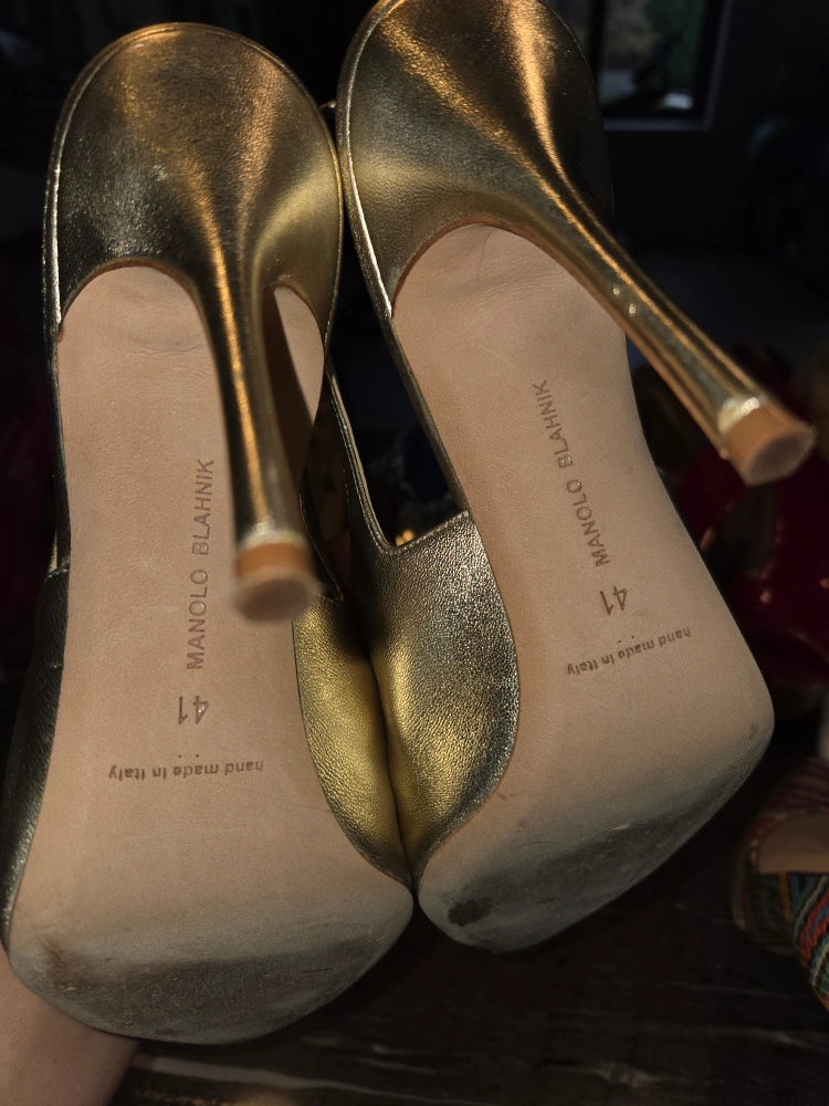 Selling a pair of Manolo Blahnik slingback heels in a beautiful gold colour. These are a size 41 and are in good condition. Made in Italy, these heels are a classic and elegant addition to any wardrobe!