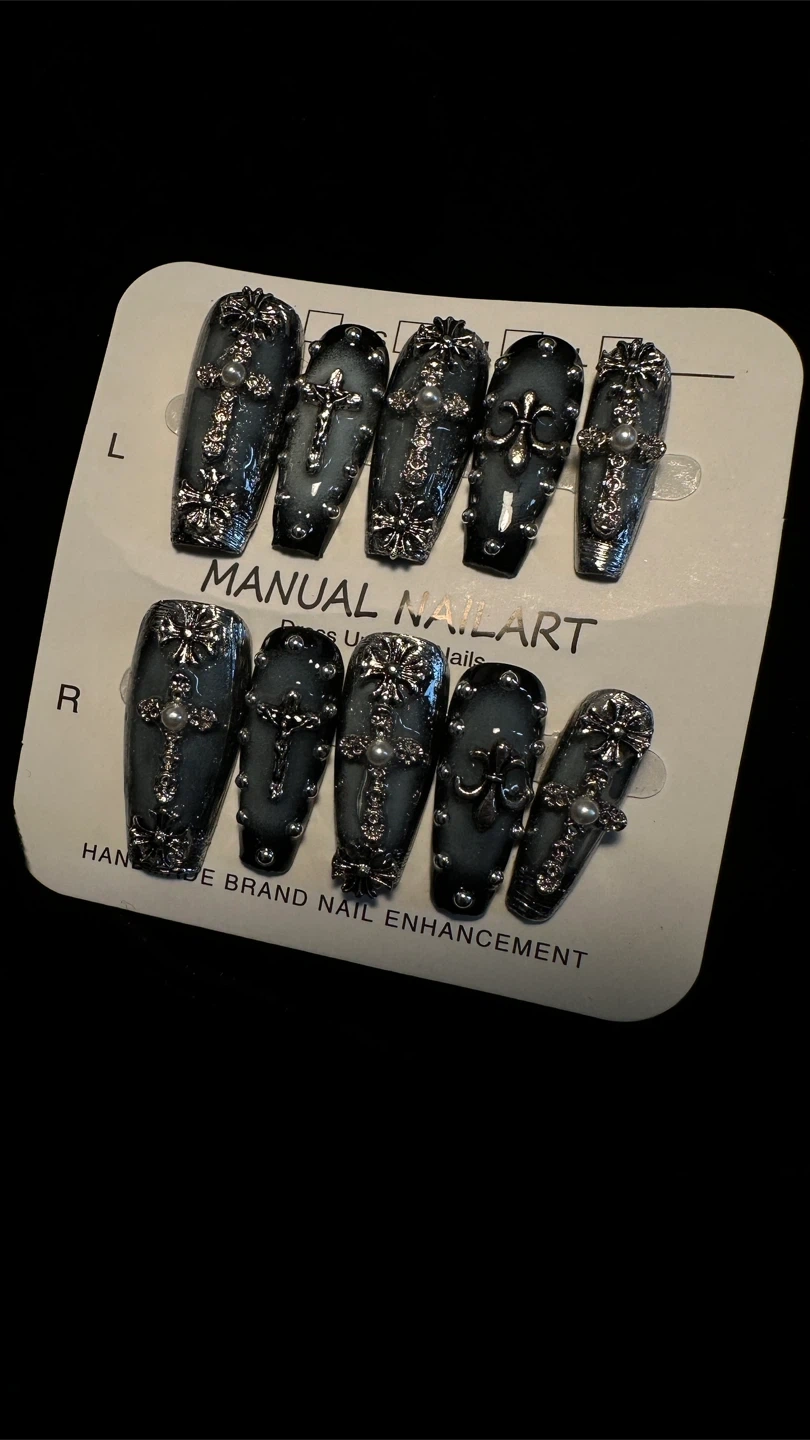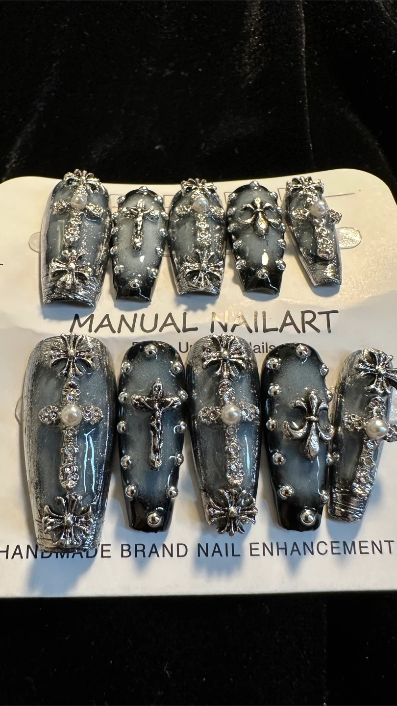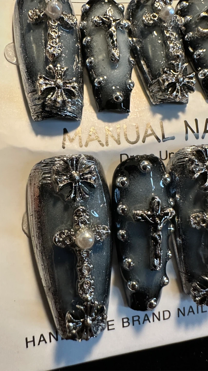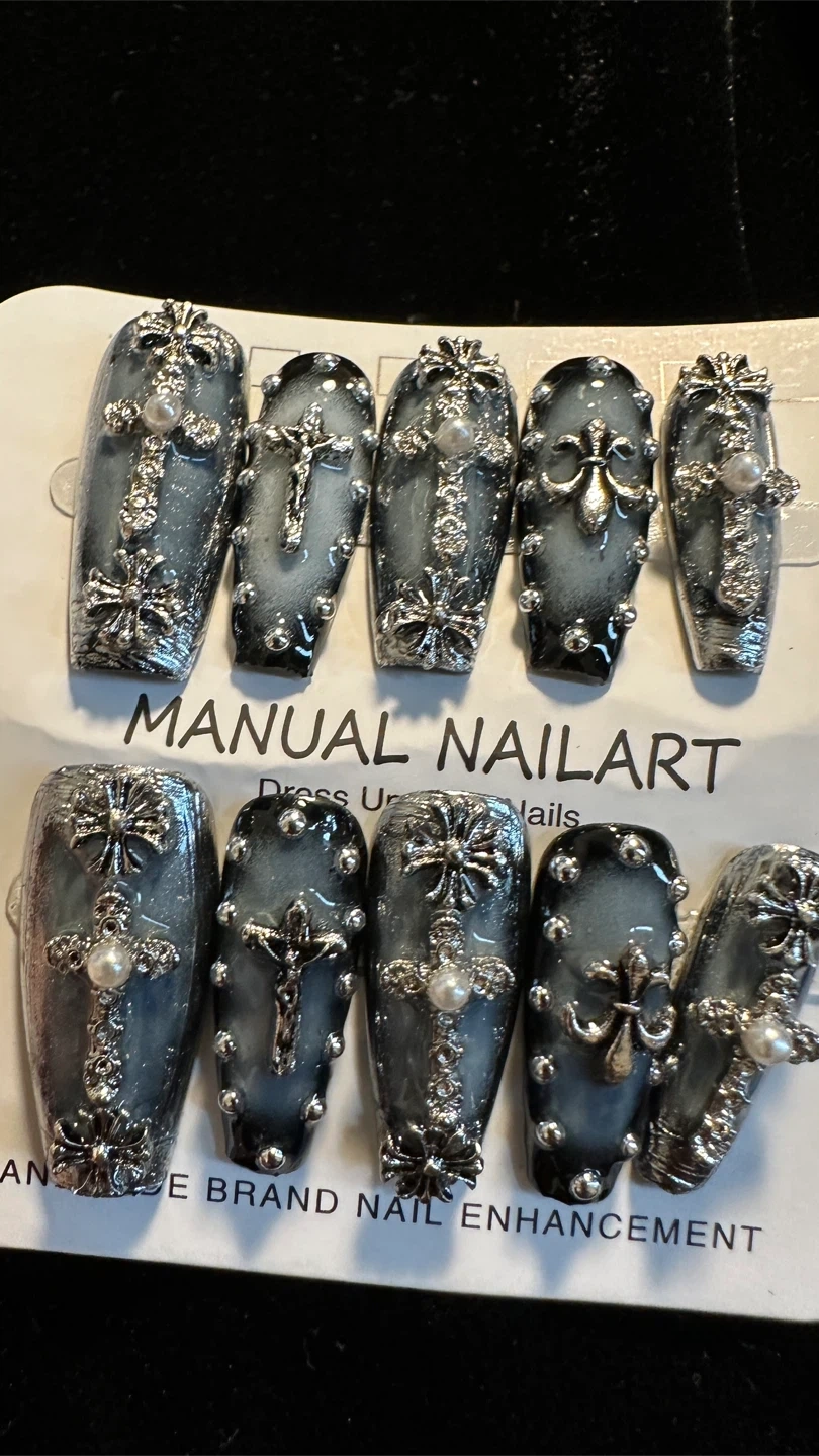 10Selling a set of Manual Nailart press-on nails. They feature a unique coffin shape with a grey and black gradient and silver cross embellishments. Perfect for adding a touch of gothic flair to your look!