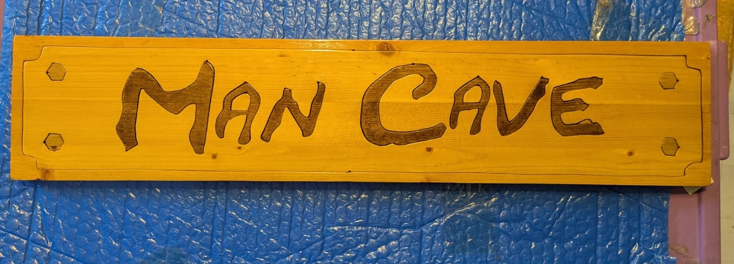 This is a handmade wooden sign that says "Man Cave". It's made of pine wood and has been finished with a clear coat. The lettering is carved out and stained dark. Great for a den, garage, or any personal hangout space!. New conditoon, gloss finish, hardboard backer. 25 1/8" W x 7/8" D x 5 1/8" H