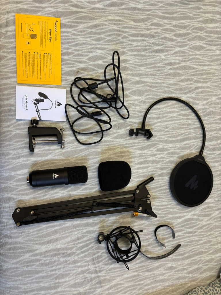 Selling a Maono AU-A04 podcasting microphone kit. It comes with all the components you see in the picture, including the microphone, pop filter, boom arm, and cables. It also includes the user manual and some warm tips from Maono. Great for anyone looking to start podcasting or improve their audio quality! - Preferably e-tranfer -Can receive cash