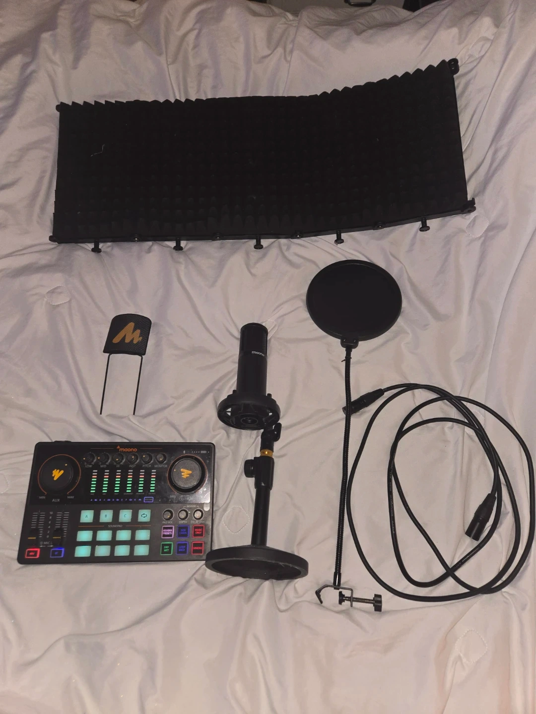 60Selling a Maonocaster USB+ microphone and audio interface setup! Includes the microphone, pop filter, reflection filter, cable, and desk stand. Perfect for podcasting, streaming, or recording music at home. Everything is in great condition and ready to use! For all skills levels.