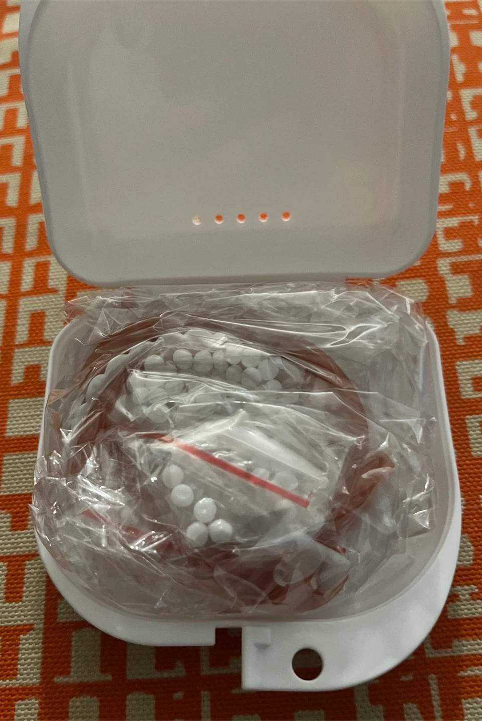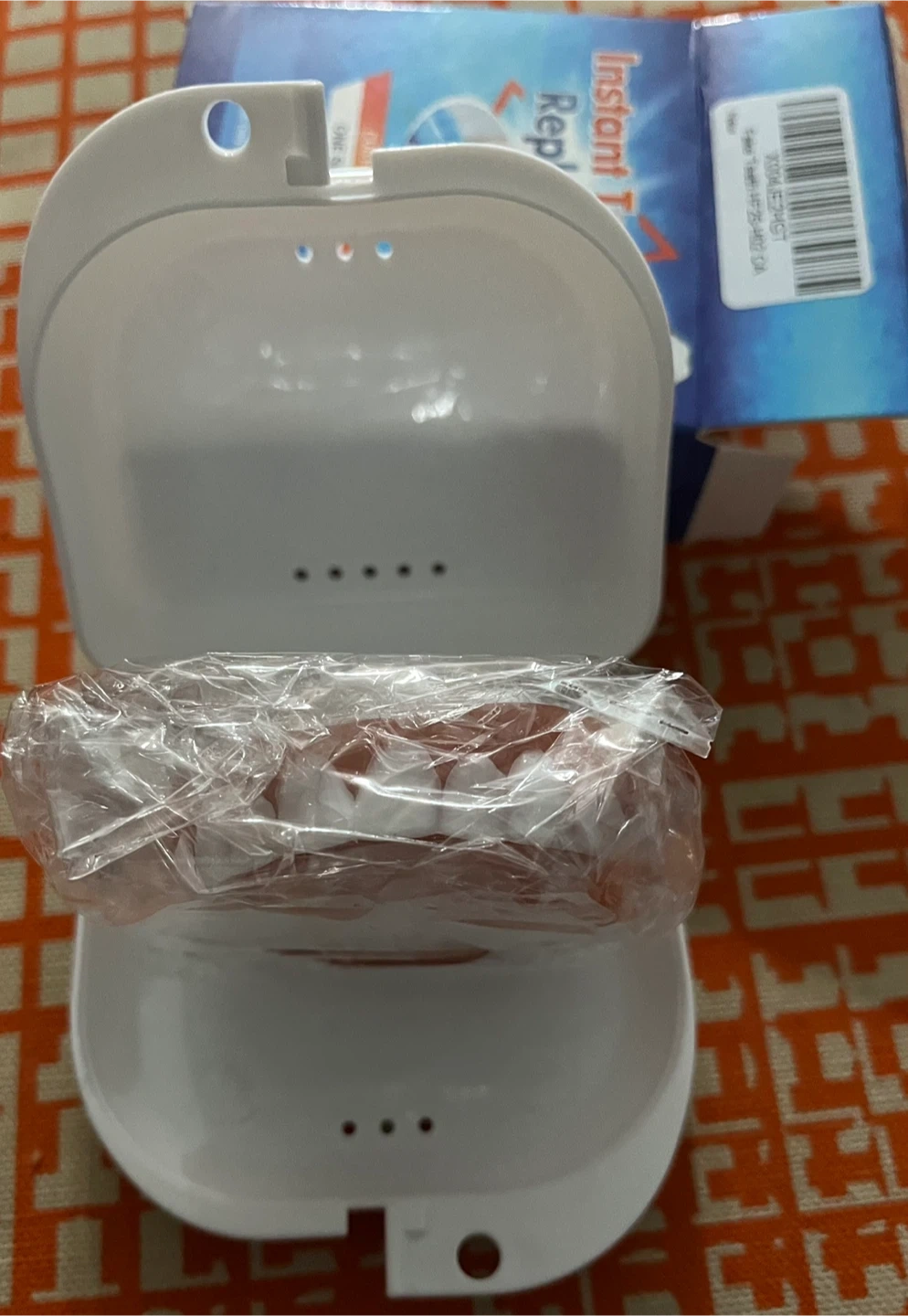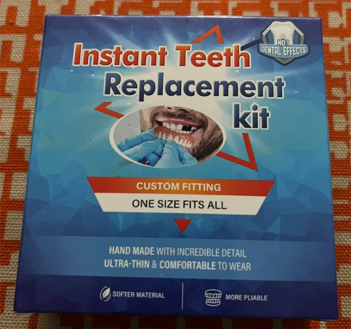 This is a new Instant Teeth Replacement kit for custom fitting. It includes cosmetic teeth, a case, and impression material. The kit is designed for a one-size-fits-all custom fit.