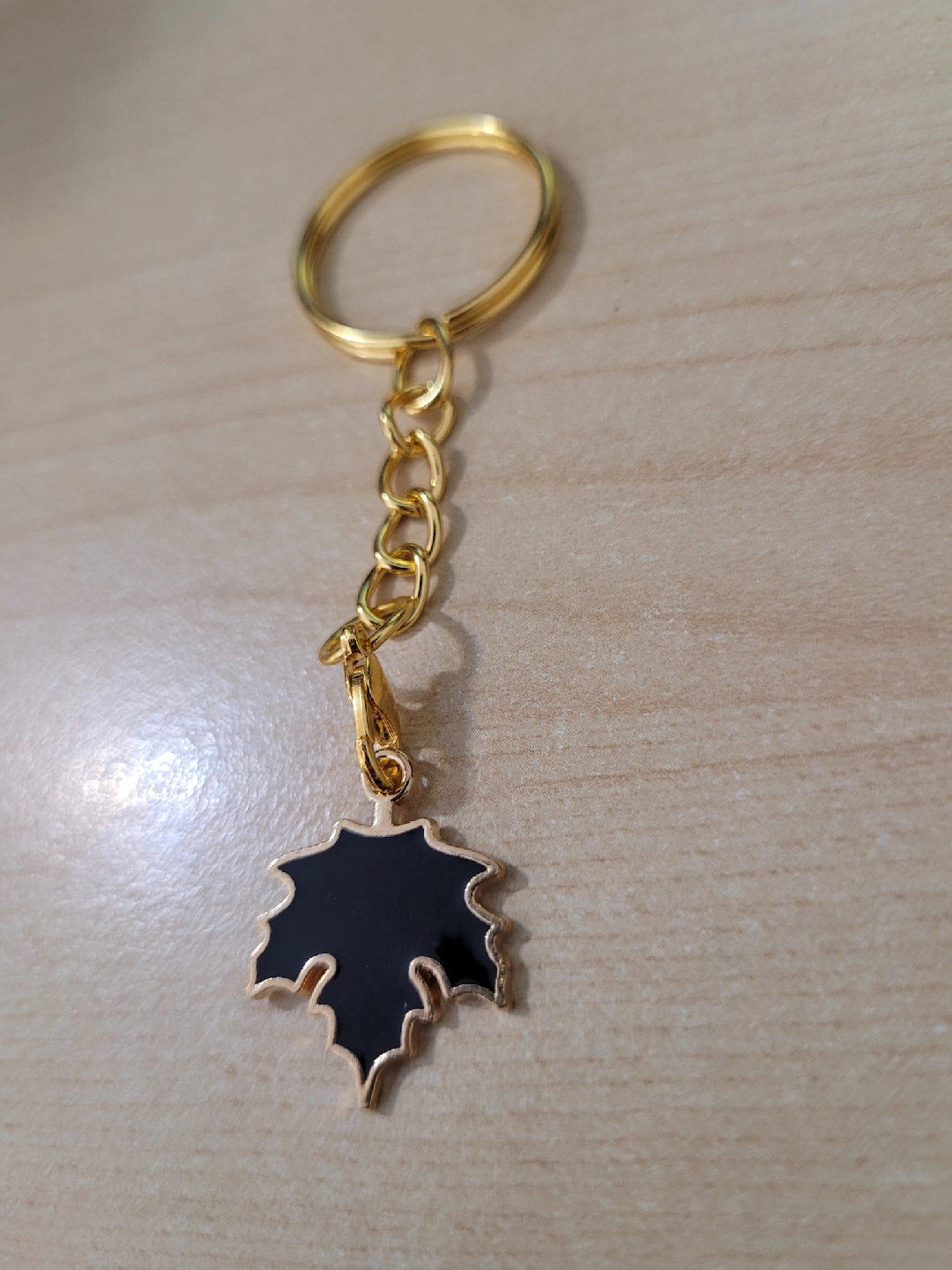 Cute maple leaf keychain with a black leaf and golden trim and chain. Perfect for showing off your Canadian pride! $2 each or $1 each if you buy more than one.