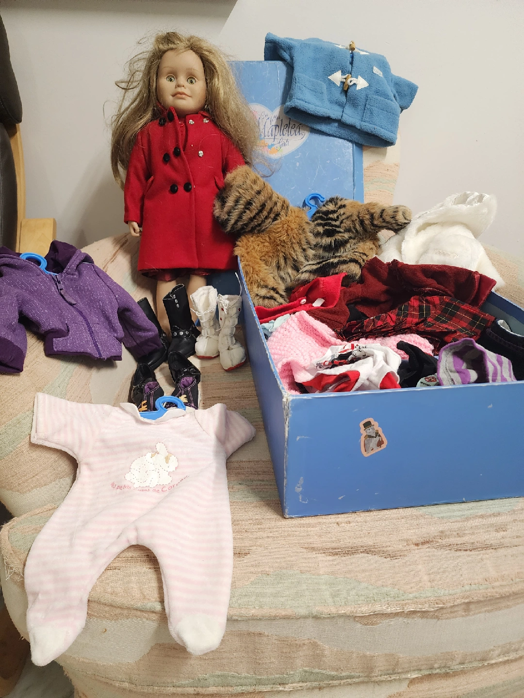 Selling a Maplelea doll with a variety of clothing and accessories. Includes a red coat, boots, and other outfits. The doll is in good condition and ready for a new home!