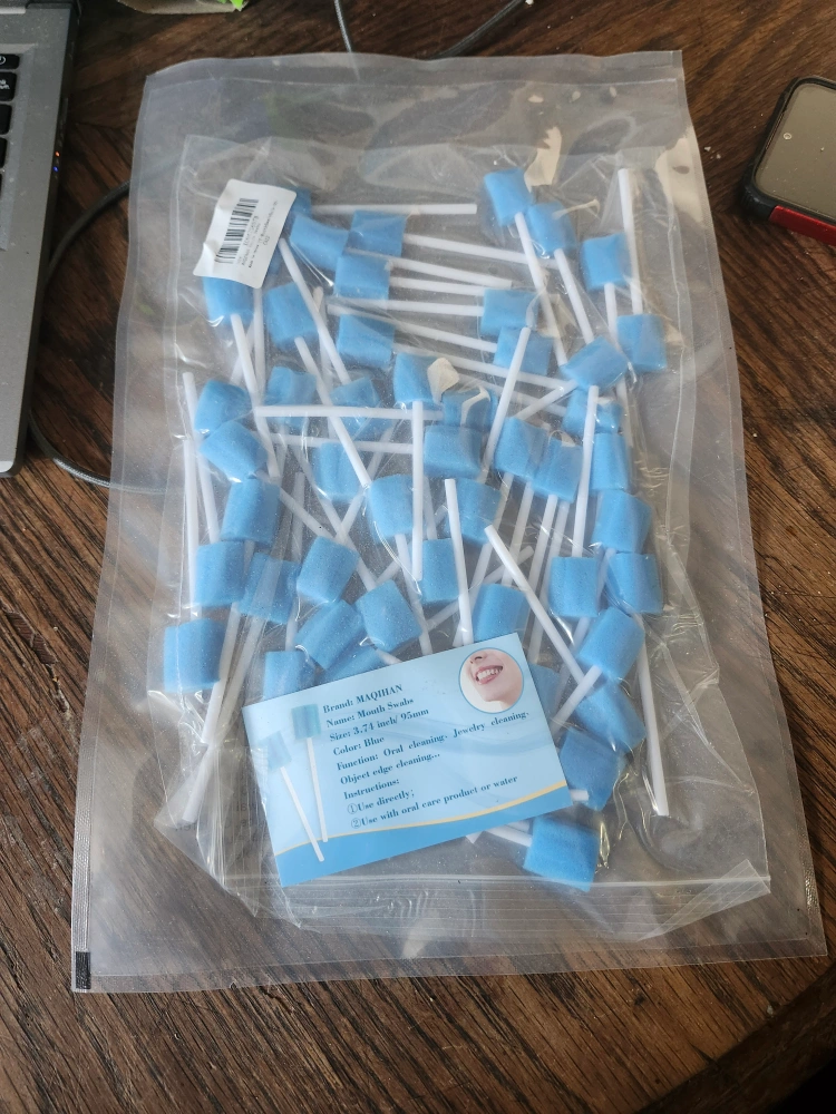 I'm selling a bag of MAQIHAN mouth swabs. They are 3.74 inches / 95mm in size and blue in colour. They can be used for: - Oral cleaning - Jewelry cleaning - Object edge cleaning Instructions: - Use directly - Use with oral care product or water