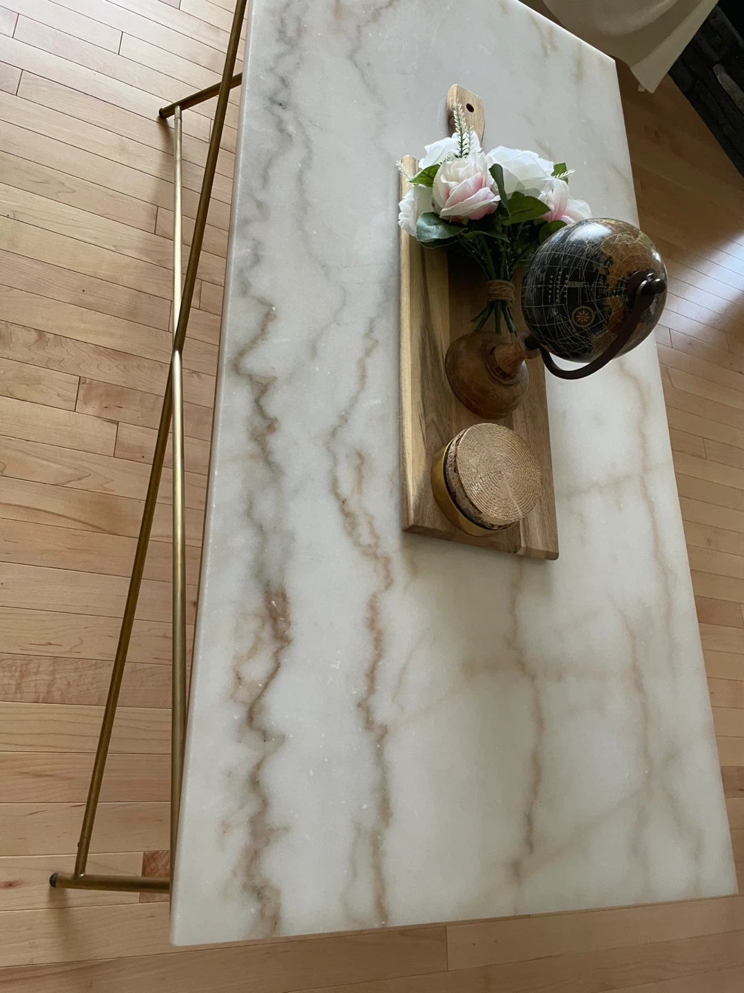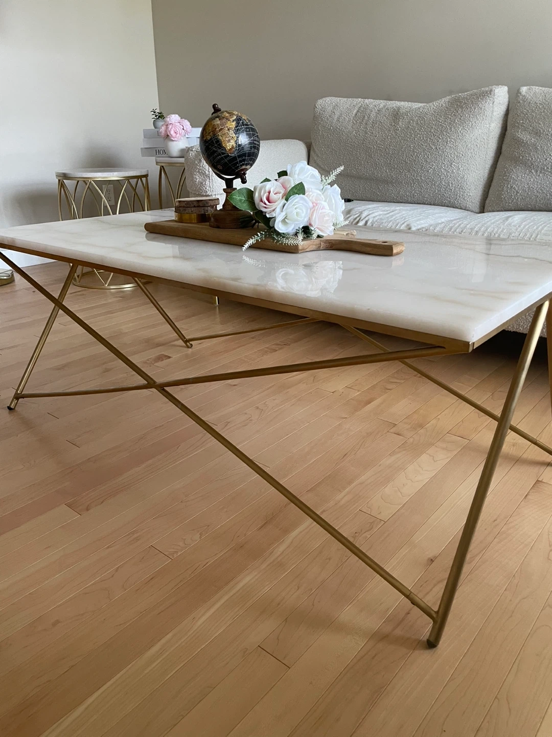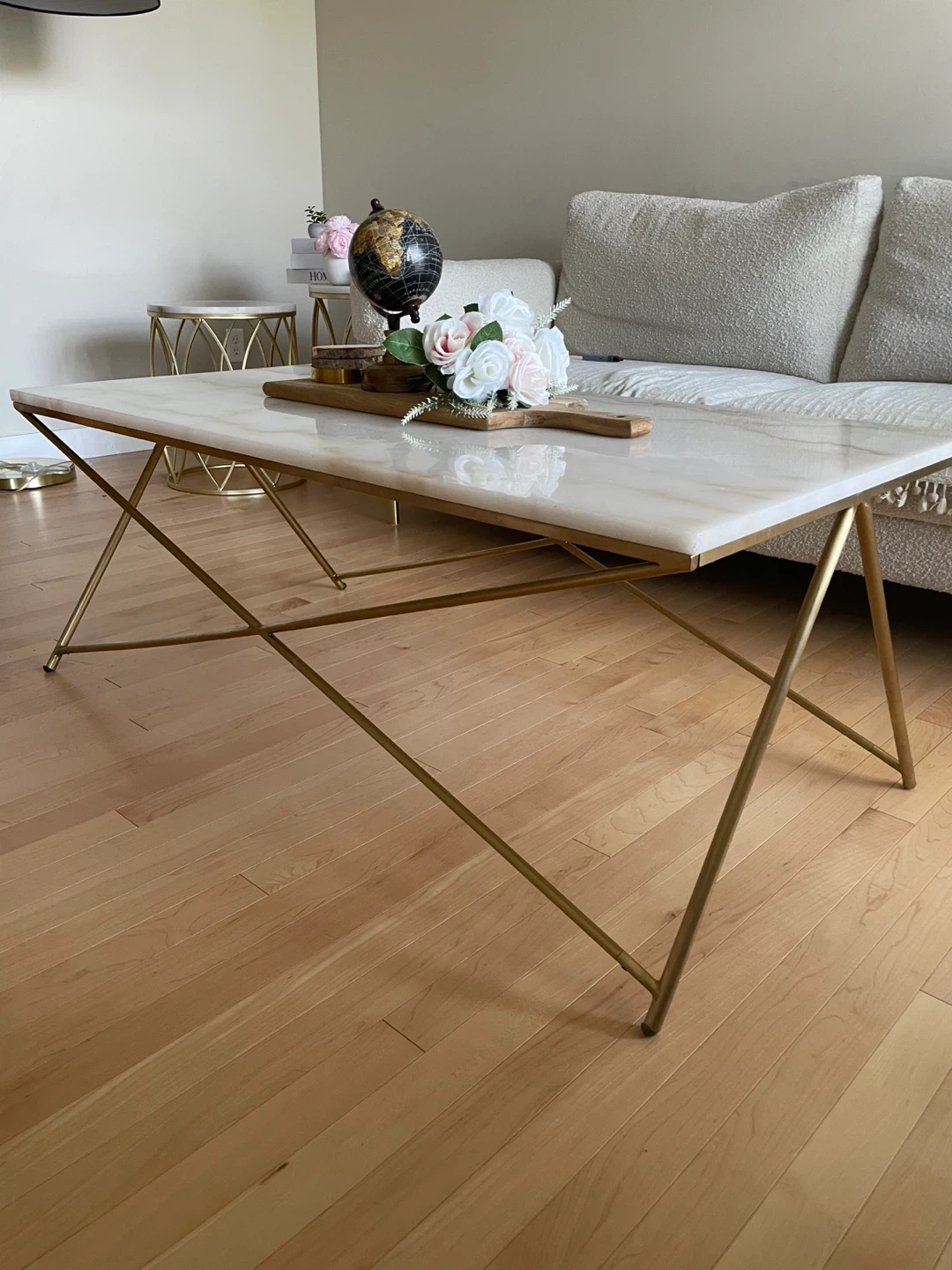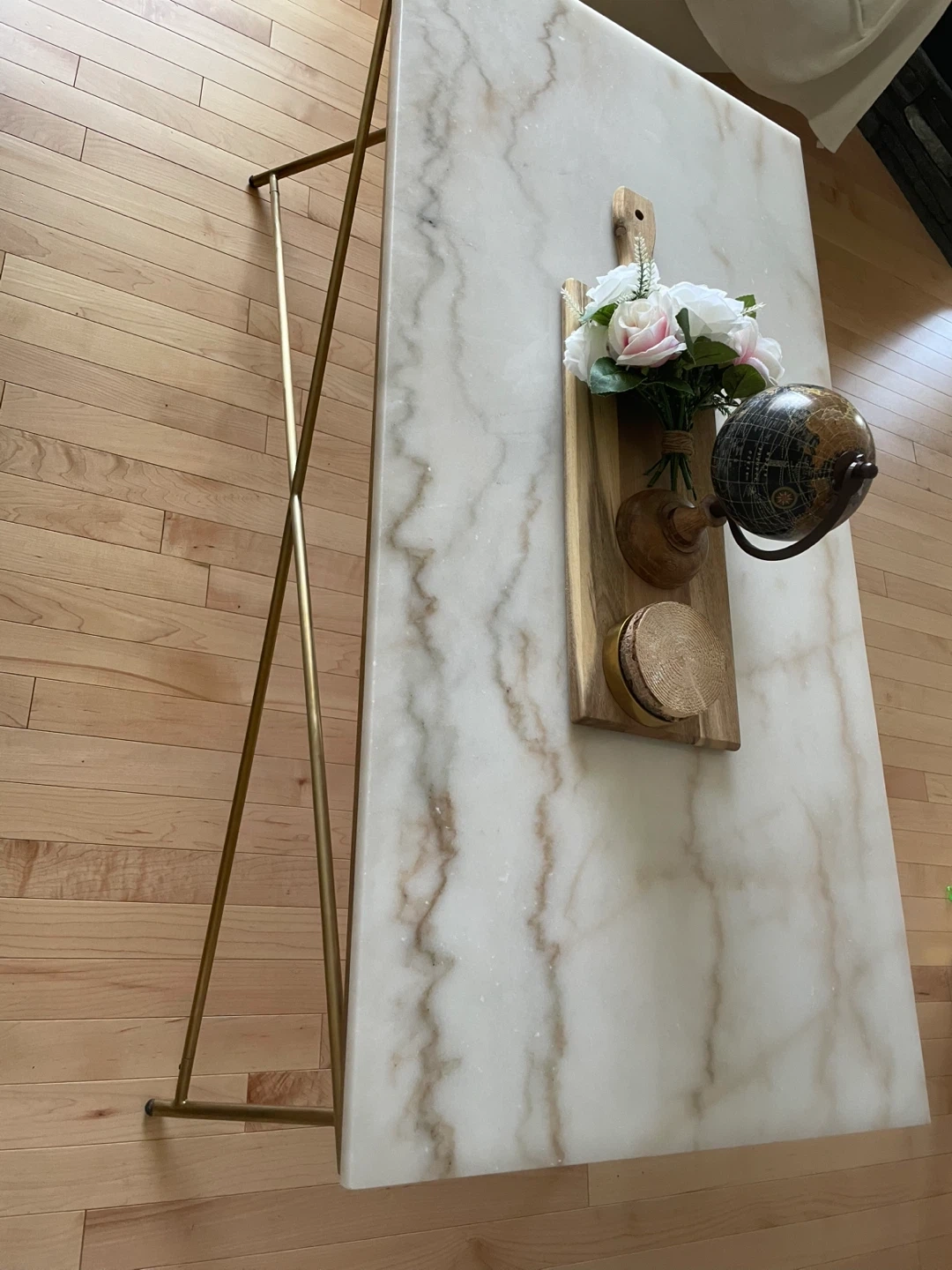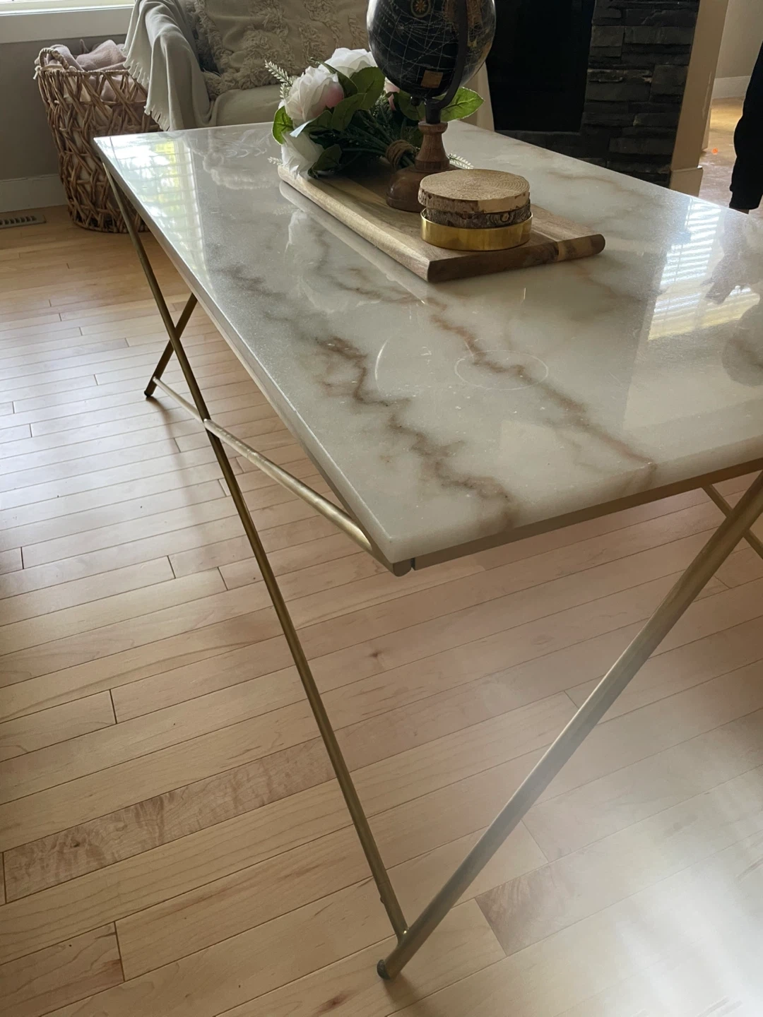 Selling a stylish coffee table featuring a beautiful marble top and elegant gold legs. It's in great condition and would be a lovely addition to any living room! Dimension: 47,5 x24 inches and height 18 inches