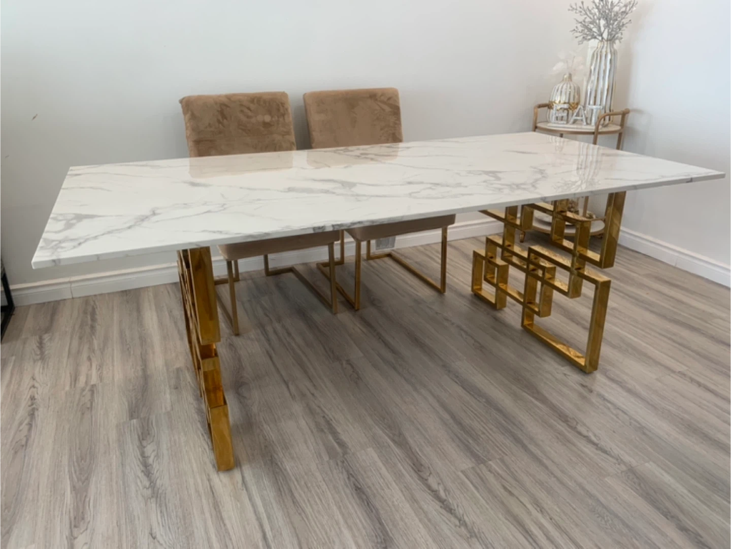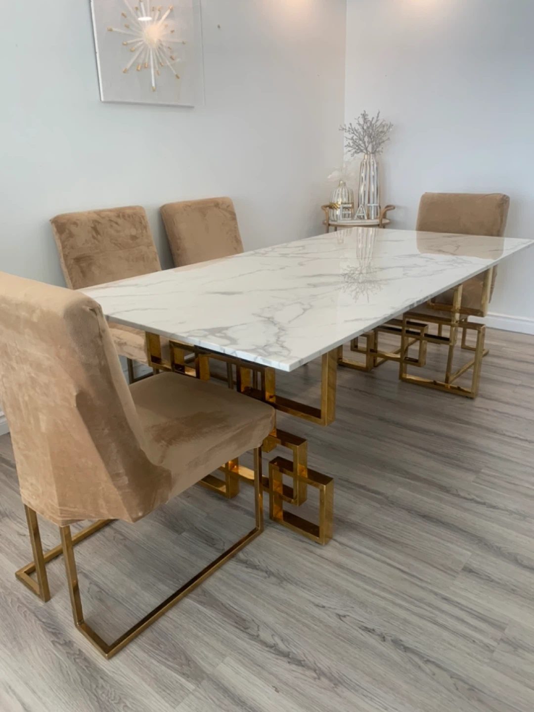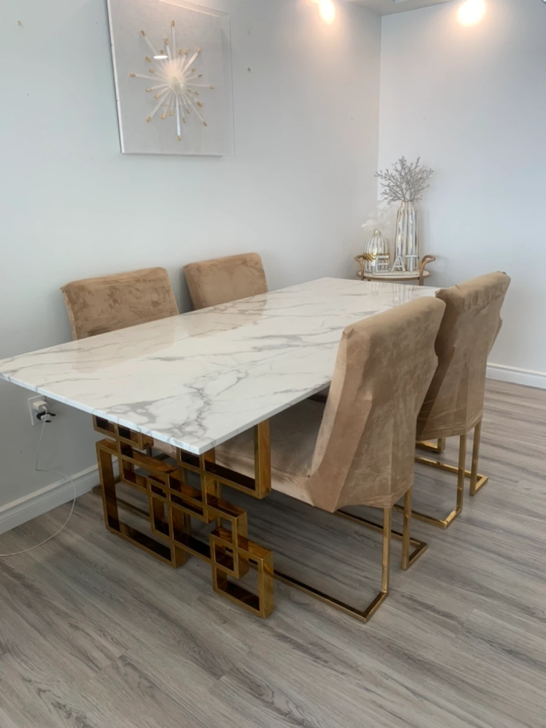 58Selling a beautiful marble dining table with a unique gold geometric base. It comes with four matching chairs with gold legs and tan upholstery. The chairs are in great condition and complement the table perfectly. This set would be a stunning addition to any dining room! In store prices is more than $3,000. I will give brown chairs cover for free.