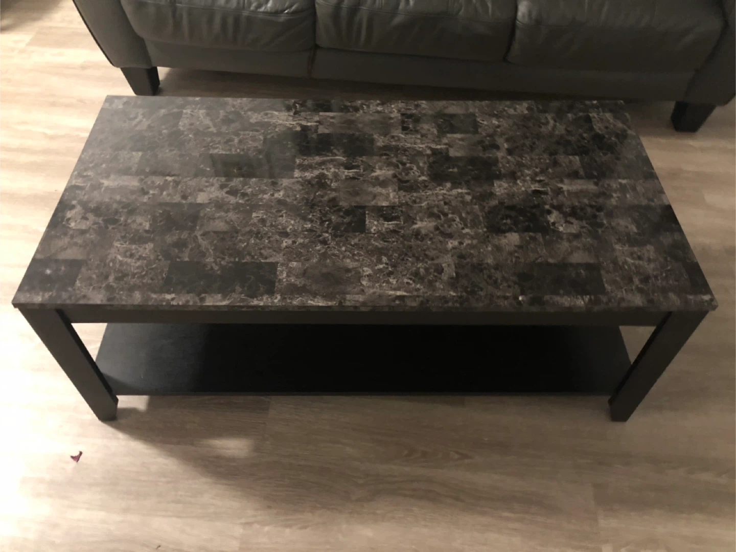 78Selling a coffee table/end table with a marble-look top and a shelf underneath brought in Brick furniture showroom. It's in perfect condition and would be a great to any living room or bedroom! 1 rectangular coffee table - 80 2 square side tables - 40 each Together 3 tables - 150