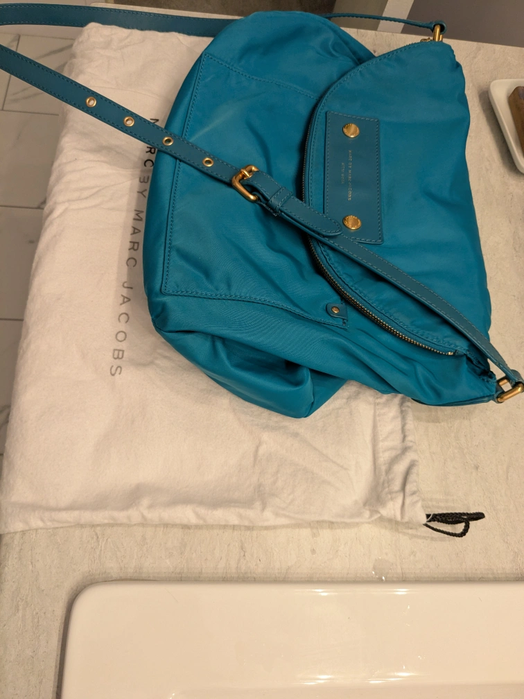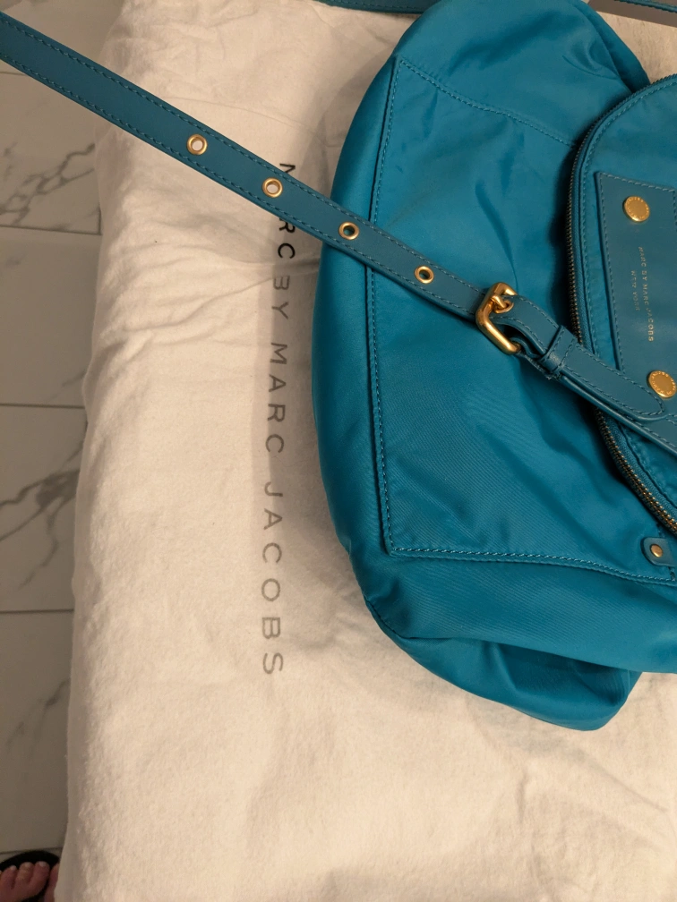 Selling a Authentic Marc by Marc Jacobs handbag in a vibrant teal blue colour. It's made of nylon and has gold-tone hardware. The bag is in great condition and comes with its original dust bag. It's a stylish and practical bag for everyday use! Great condition Lots of pockets pickup only cash only please