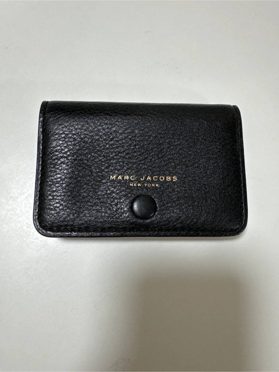 105Here's a stylish black leather card holder from Marc Jacobs. It's in great condition and perfect for keeping your cards organized. The leather has a nice texture, and it's a compact size that fits easily in your pocket or bag. A classic accessory to keep your cards safe and accessible