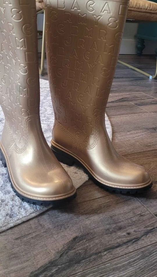 28Selling a pair of Marc Jacobs rain boots in a stylish gold colour. The boots feature the brand's name embossed all over. Great for keeping your feet dry and fashionable on rainy days! Size 37EUR 6.5 US Gold Color Hardly used.