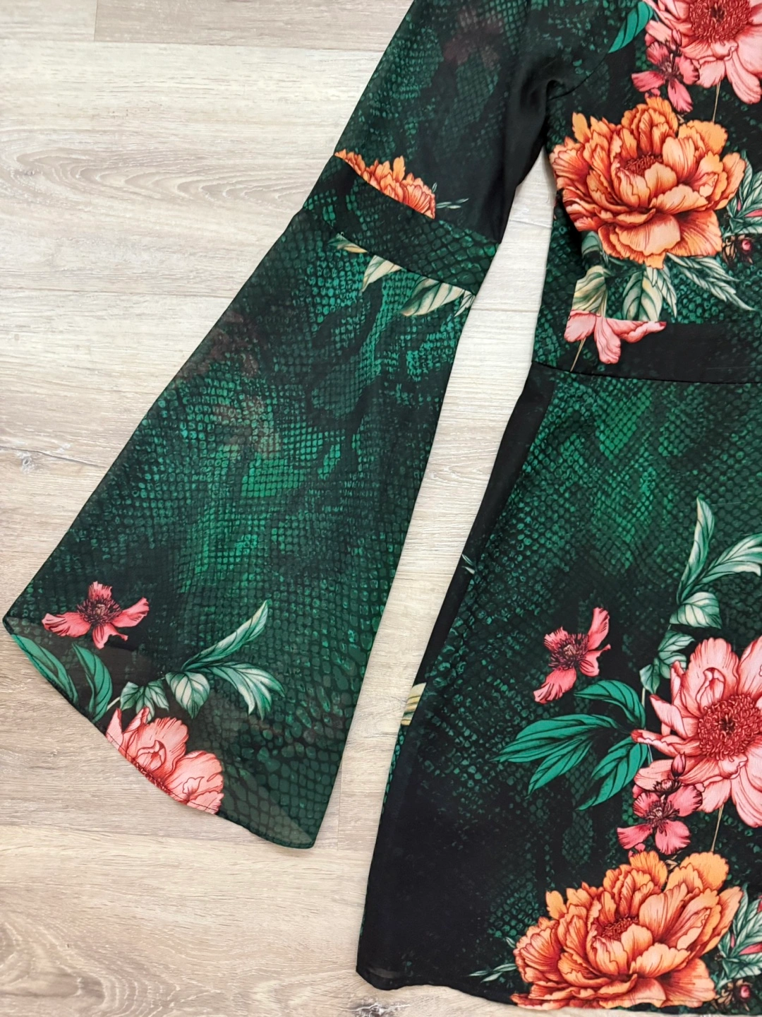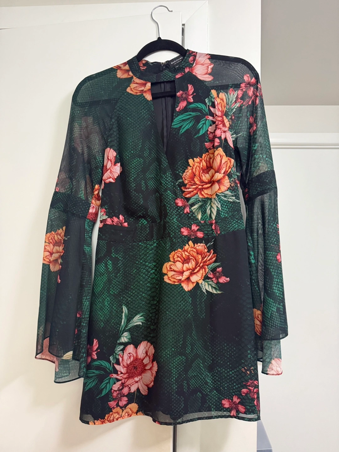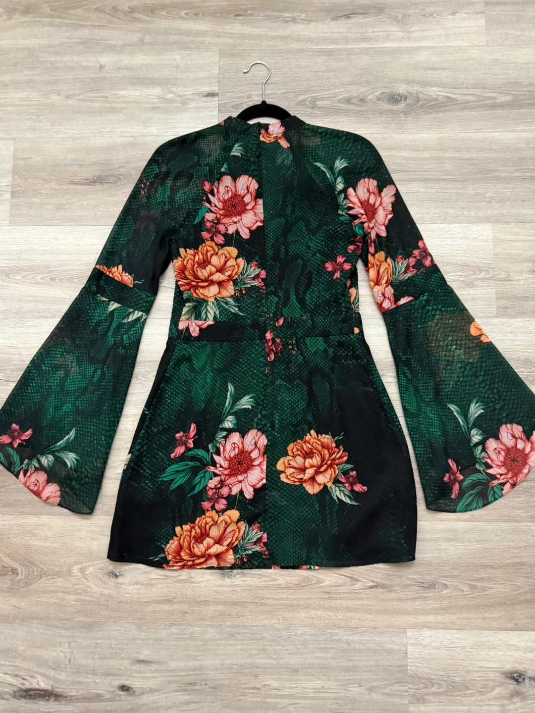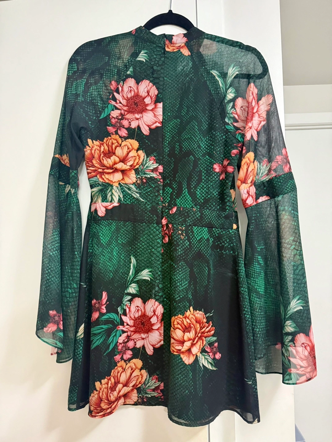 44Gorgeous mini dress. Features a snakeskin and floral print, long bell sleeves, and keyhole neckline. Perfect for a night out.