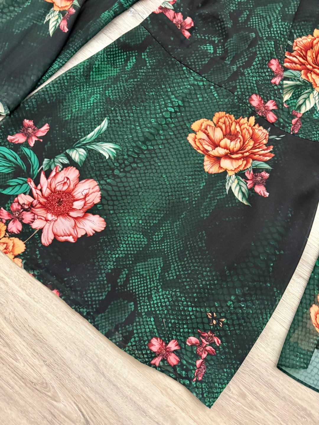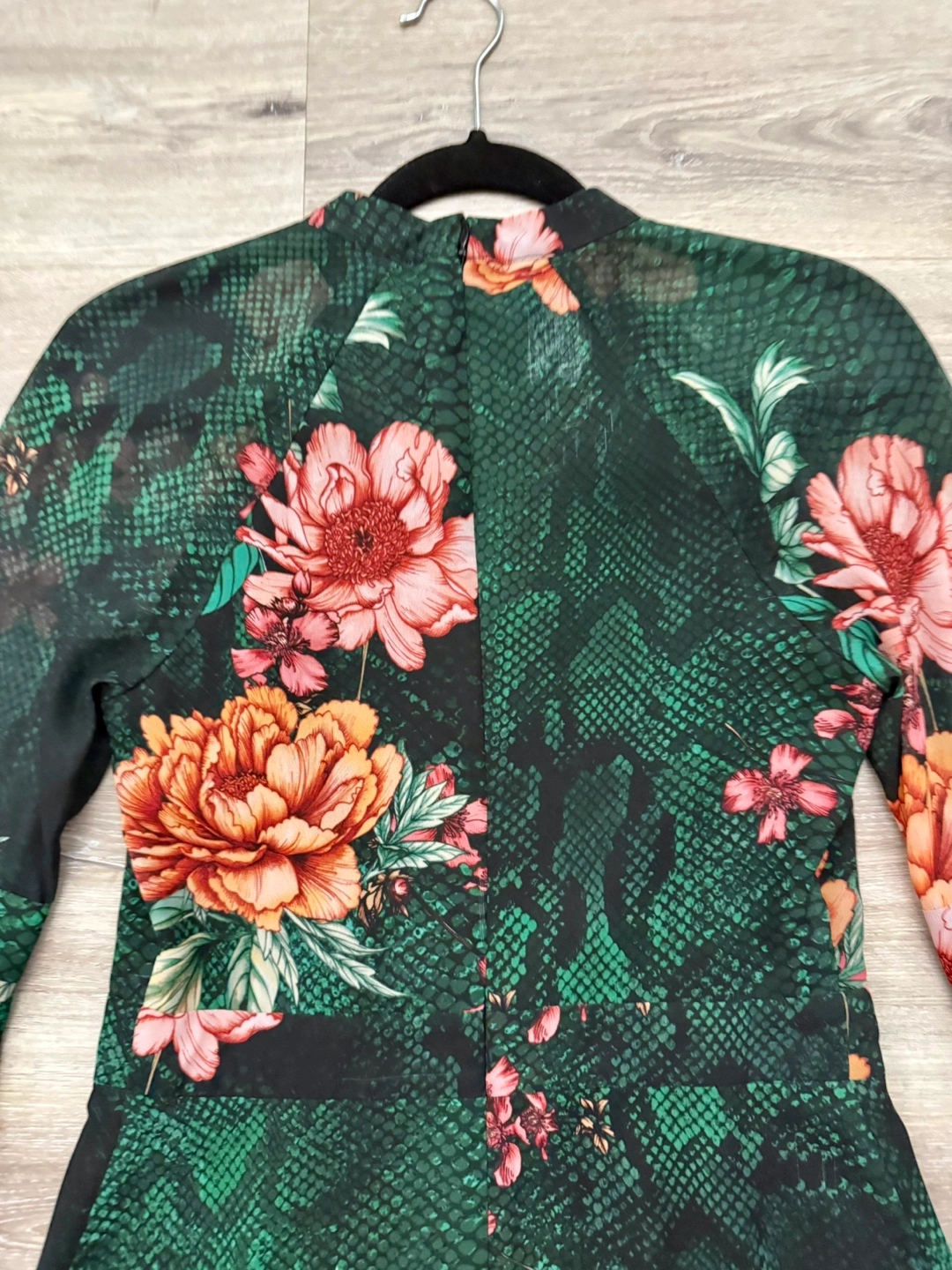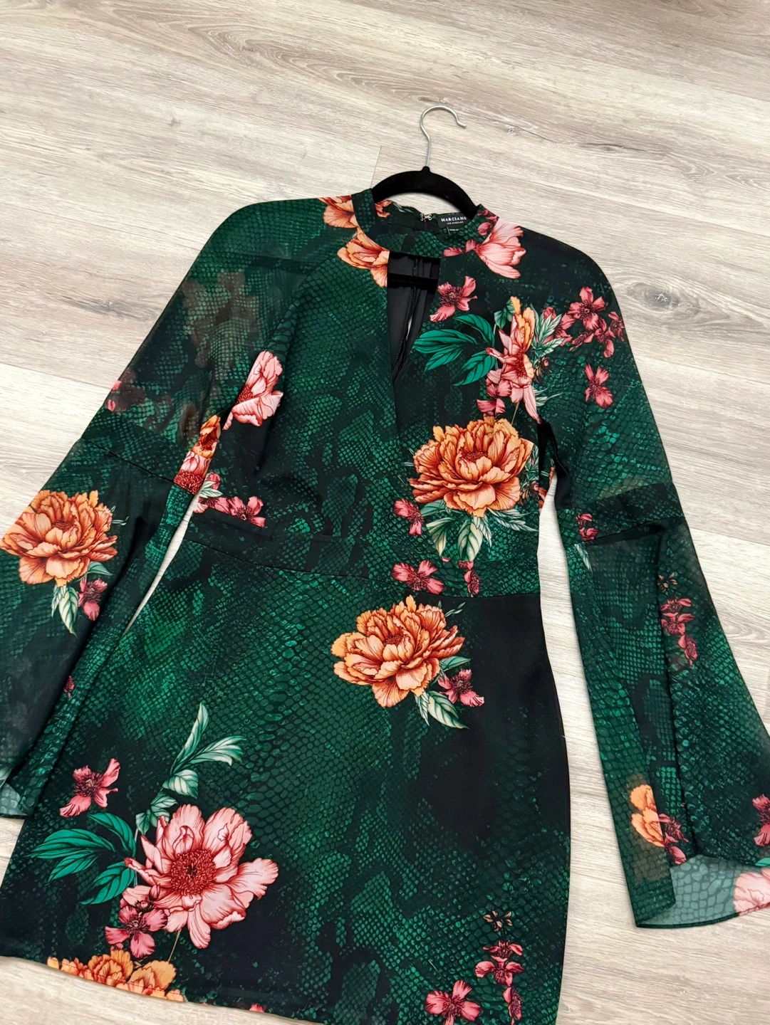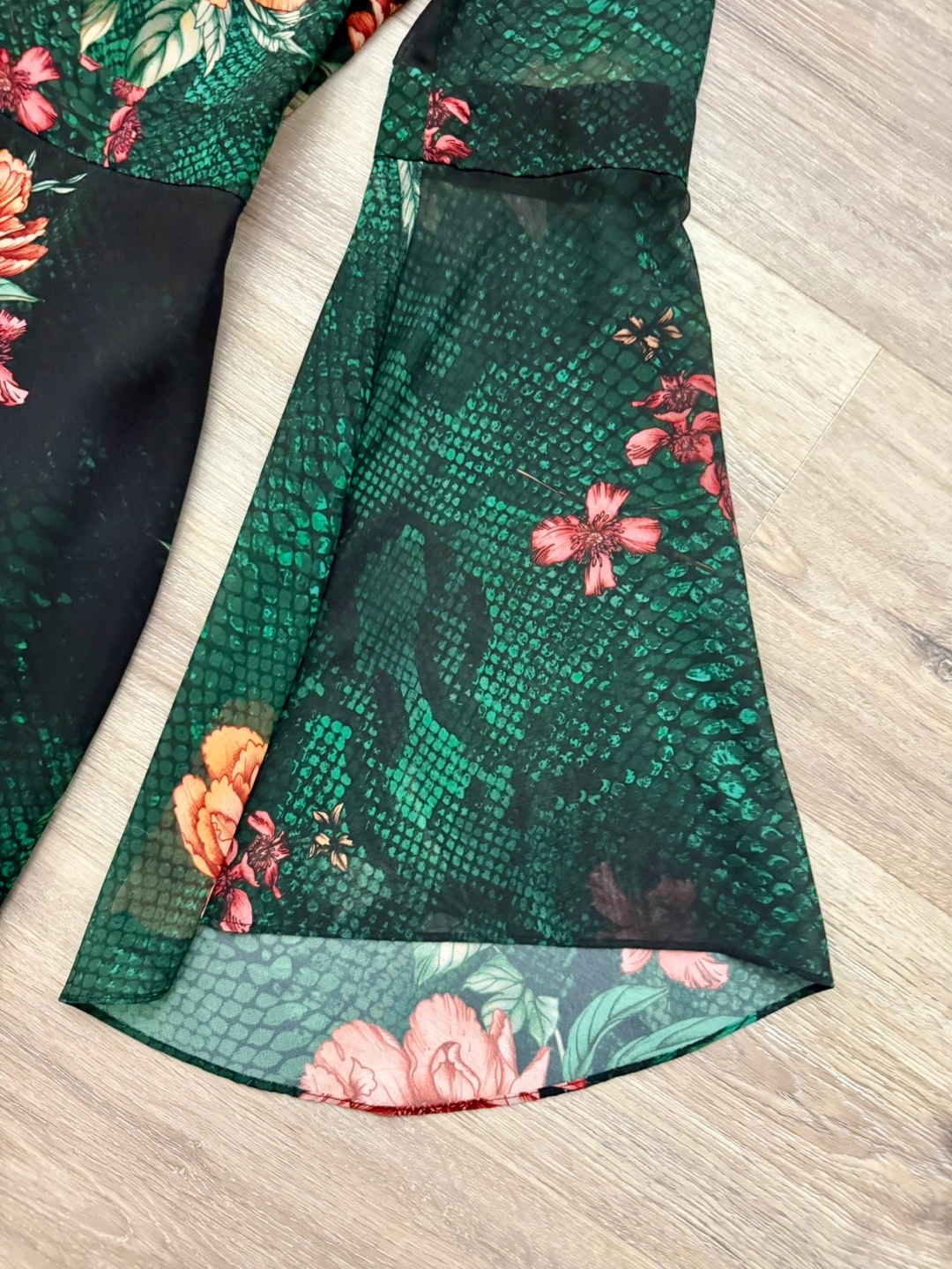 44Gorgeous mini dress. Features a snakeskin and floral print, long bell sleeves, and keyhole neckline. Perfect for a night out.