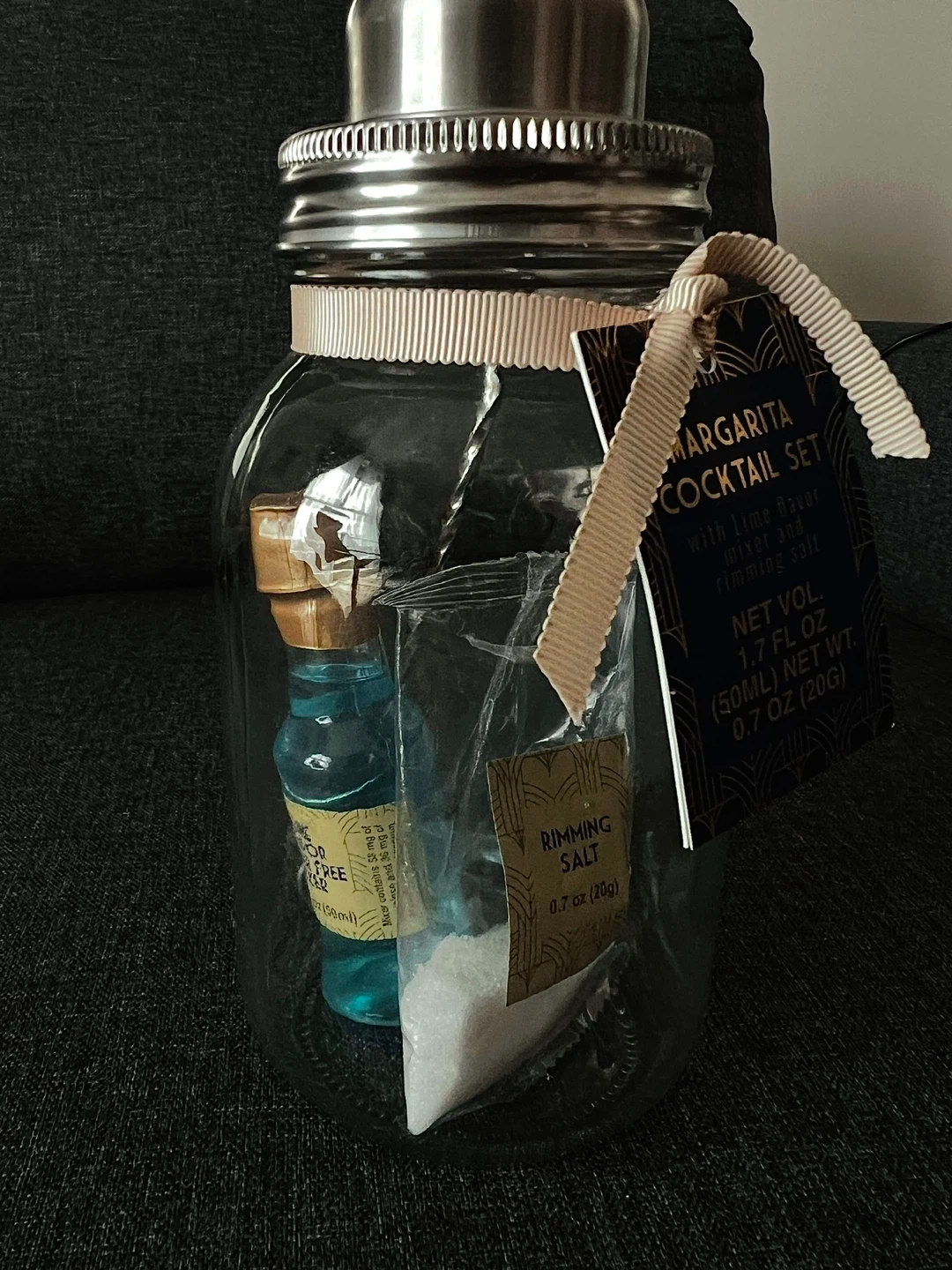 15Margarita Cocktail Set It comes with lime flavour mixer and rimming salt. The net volume of the mixer is 1.7 fl oz (50mL) and the net weight of the rimming salt is 0.7 oz (20g)