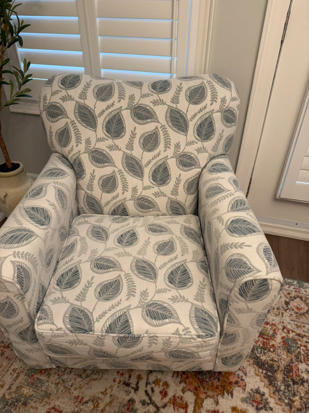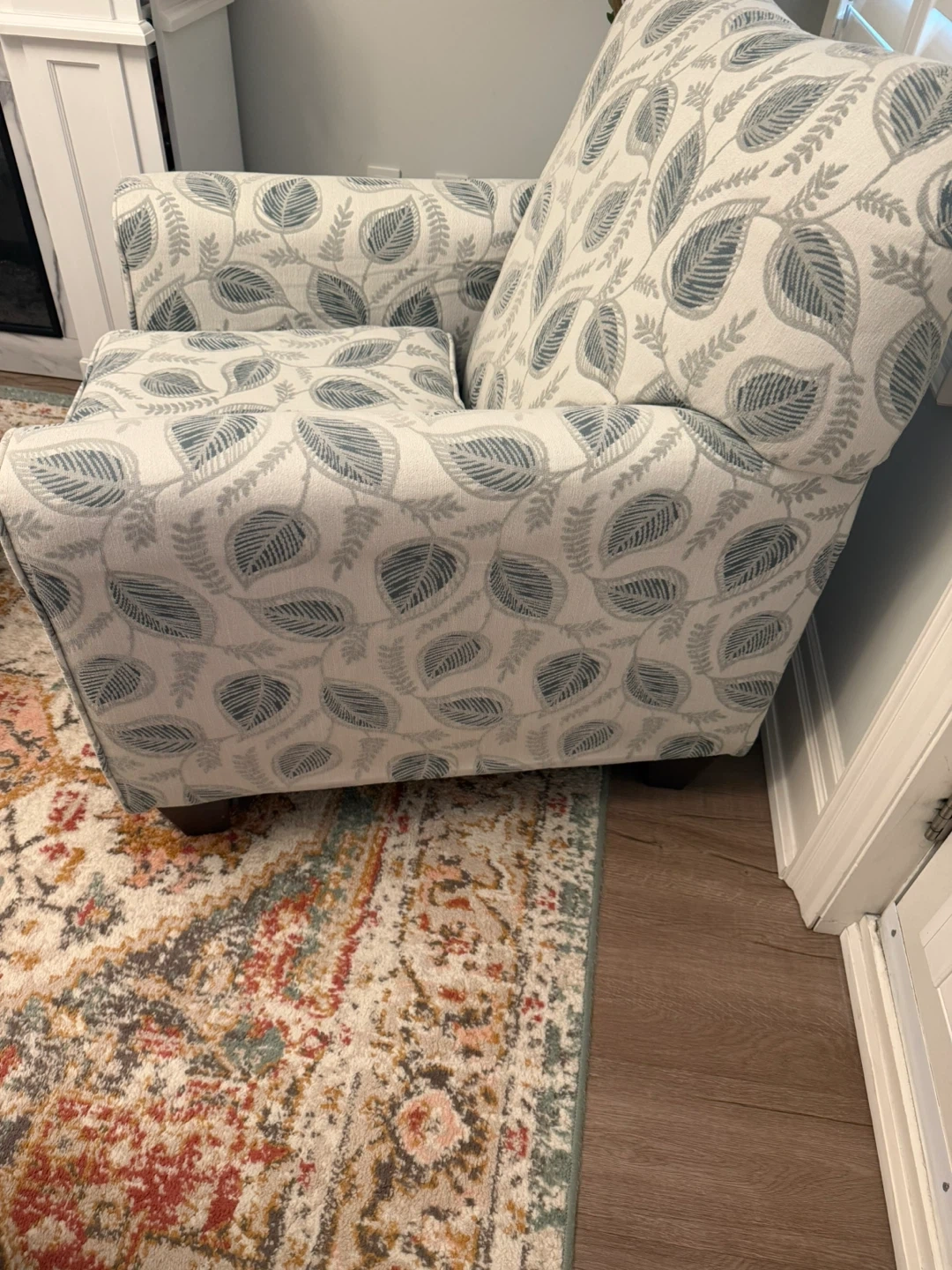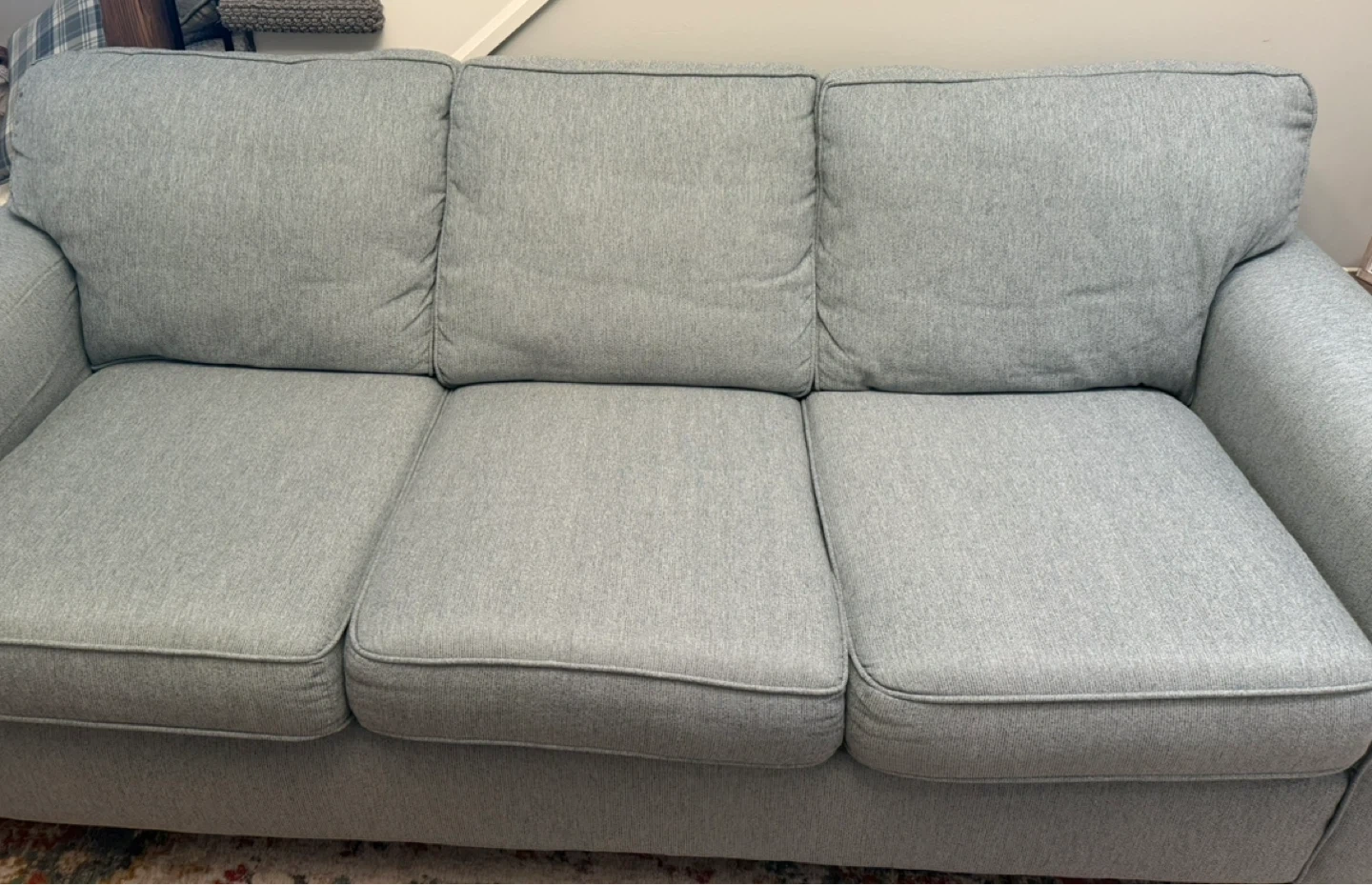 Selling a comfy three-seat sofa in a light green colour and an arm chair with leaf and matching light blue/green colour. It's in great condition and would be a lovely addition to any living room or den. The cushions are soft and supportive, perfect for lounging! Selling 500 for both couch and for arm chair. Originally bought from Brick