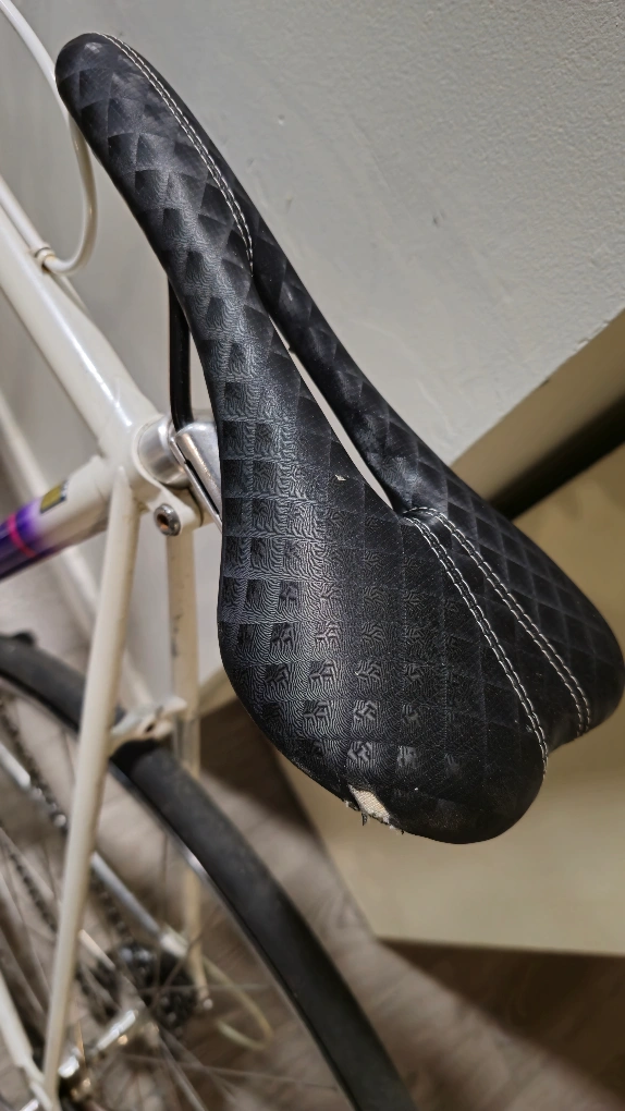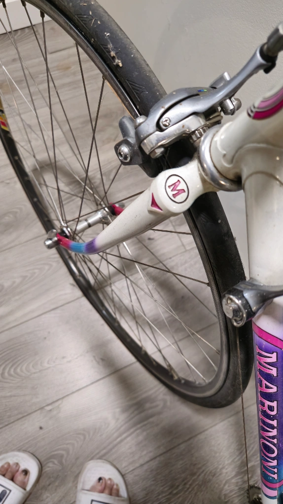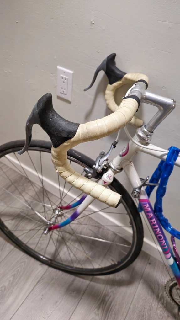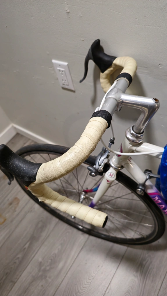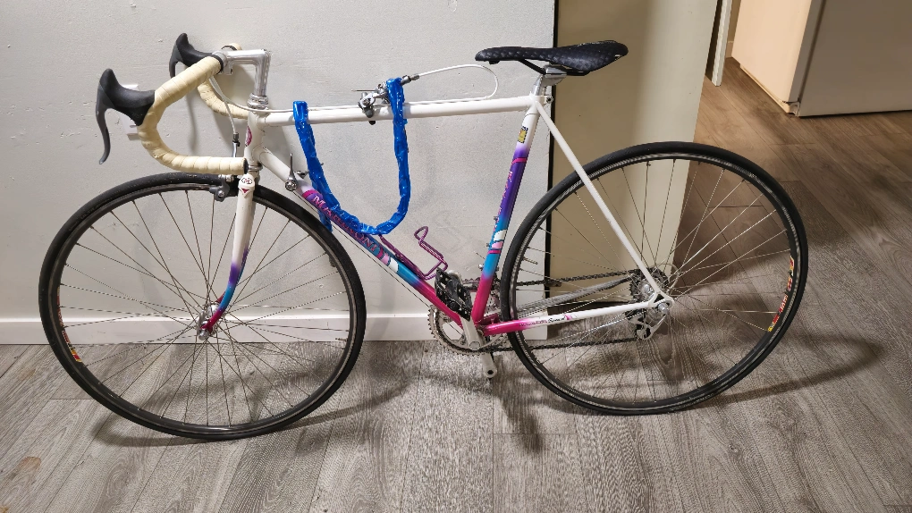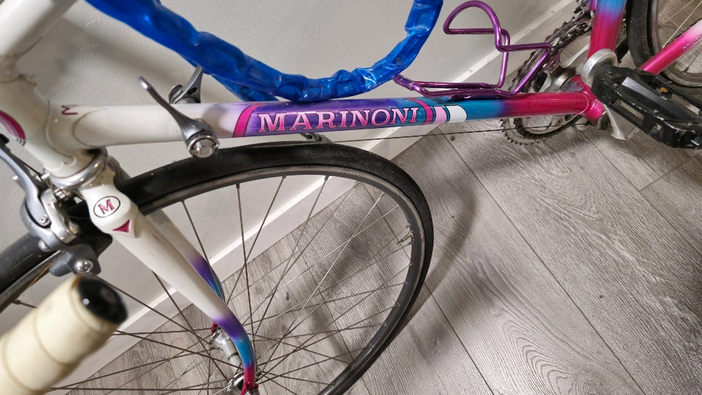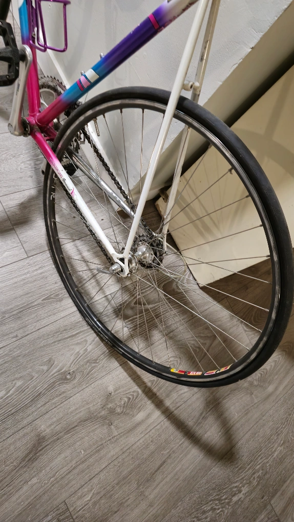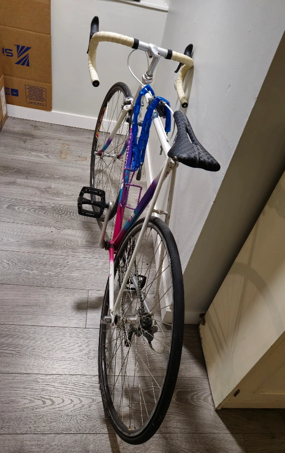 14Road bike with drop handlebars and a white frame with blue and pink paint. The bike has a few stickers on the frame. Comes with a water bottle holder. The back wheel is a little bent & flat