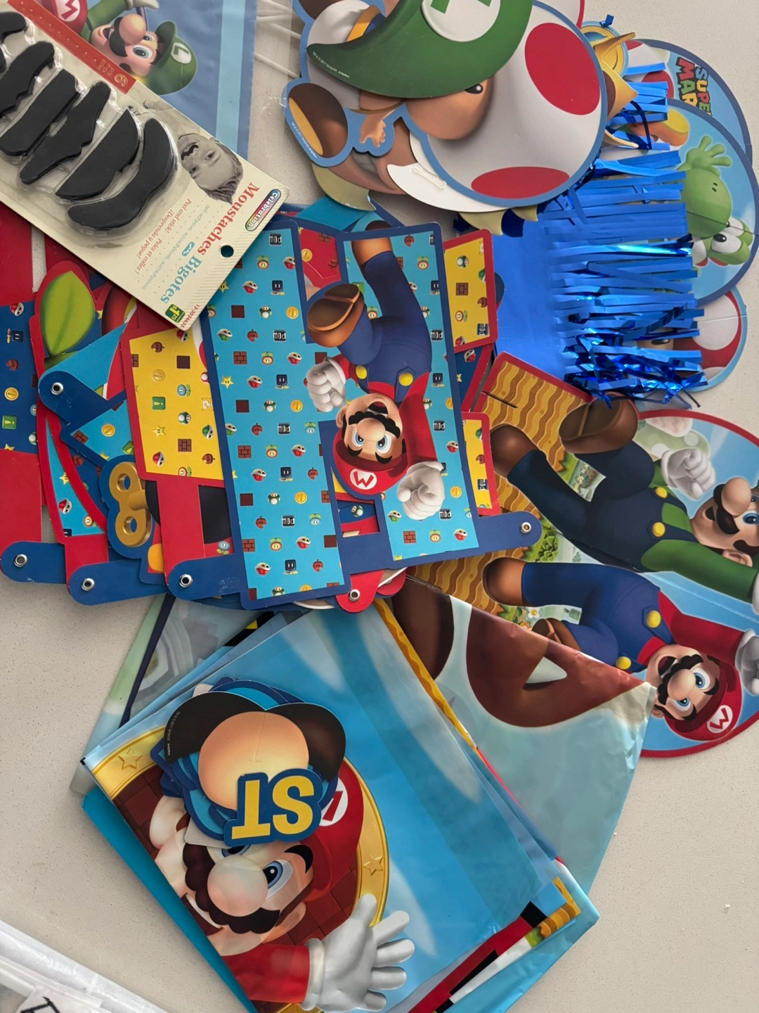 Selling a fun Mario-themed party decoration set! Includes moustaches, banners, and other decorations to make your party super! Perfect for a Super Mario fan's birthday or celebration