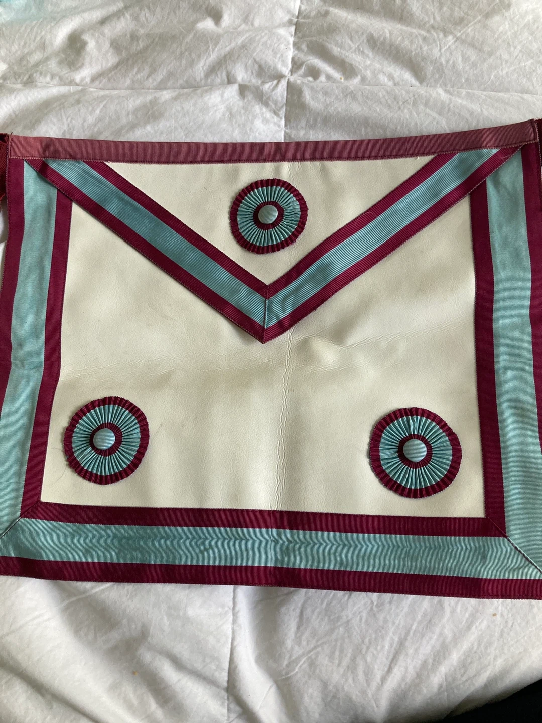 186Here's a masonic apron. It is white with burgundy and light blue trim. It has three decorative rosettes.