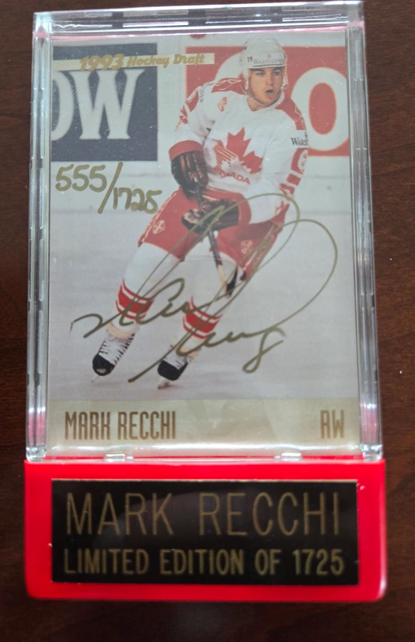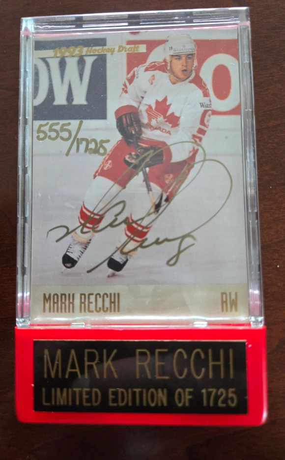 Selling a Mark Recchi autographed Rookie Team Canada hockey gold signature card. It's a limited edition, number 555 out of 1725. The card comes in a protective case from Classic Draft. A great piece for any hockey fan or card collector!