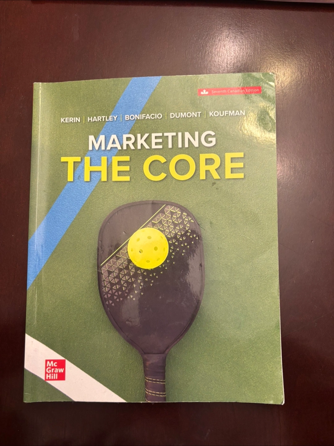 Selling "Marketing: The Core" textbook by Kerin, Hartley, Bonifacio, and Koufman. It's in great shape and perfect for marketing students!