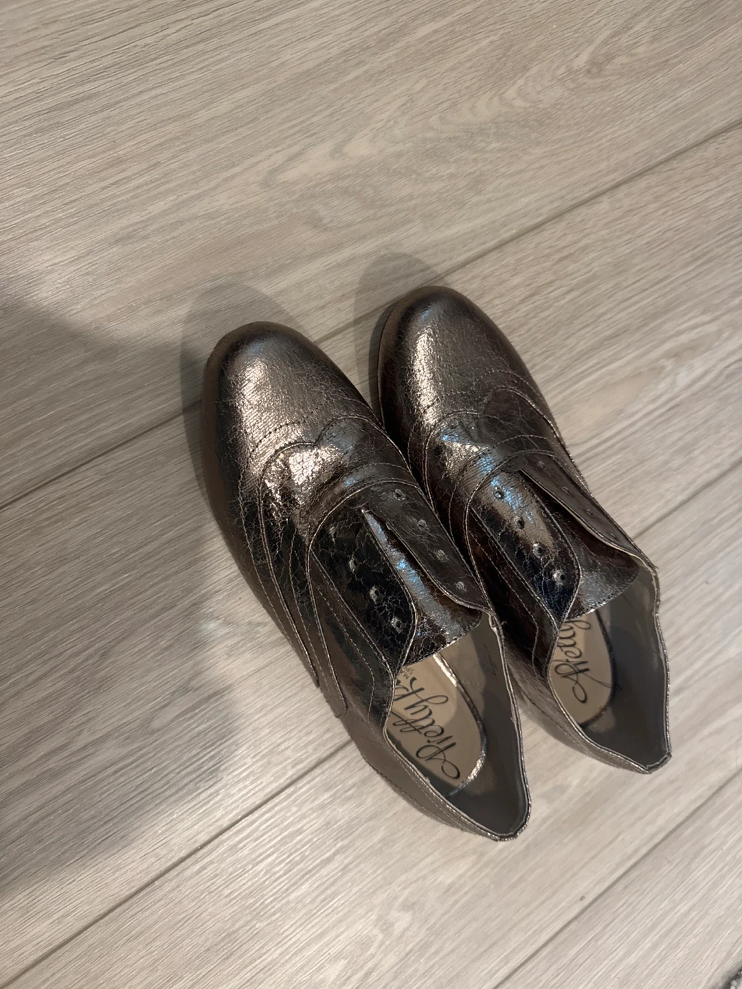 17These marks and Spencer Pretty Pumps shoes have a unique bronze metallic finish that catches the eye! They're perfect for adding a touch of sparkle to any outfit. They show some signs of wear but still have lots of life left