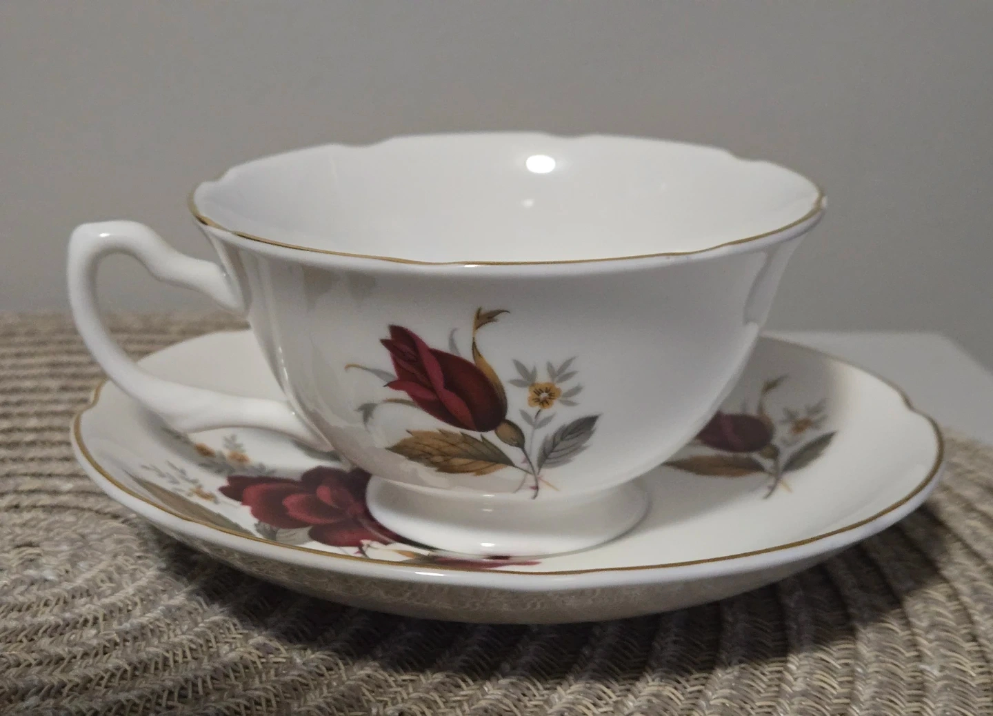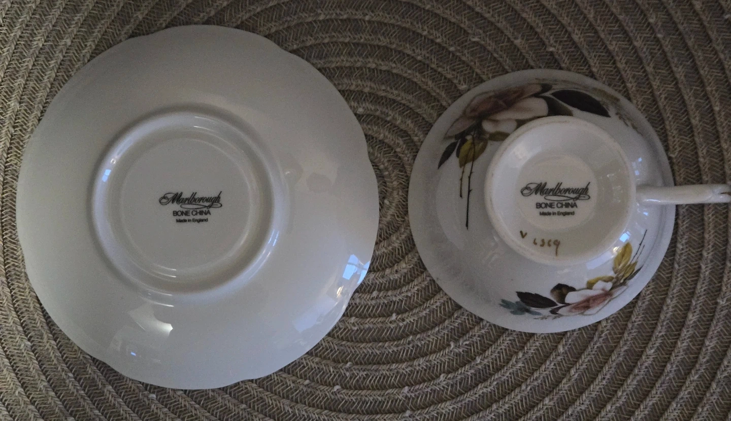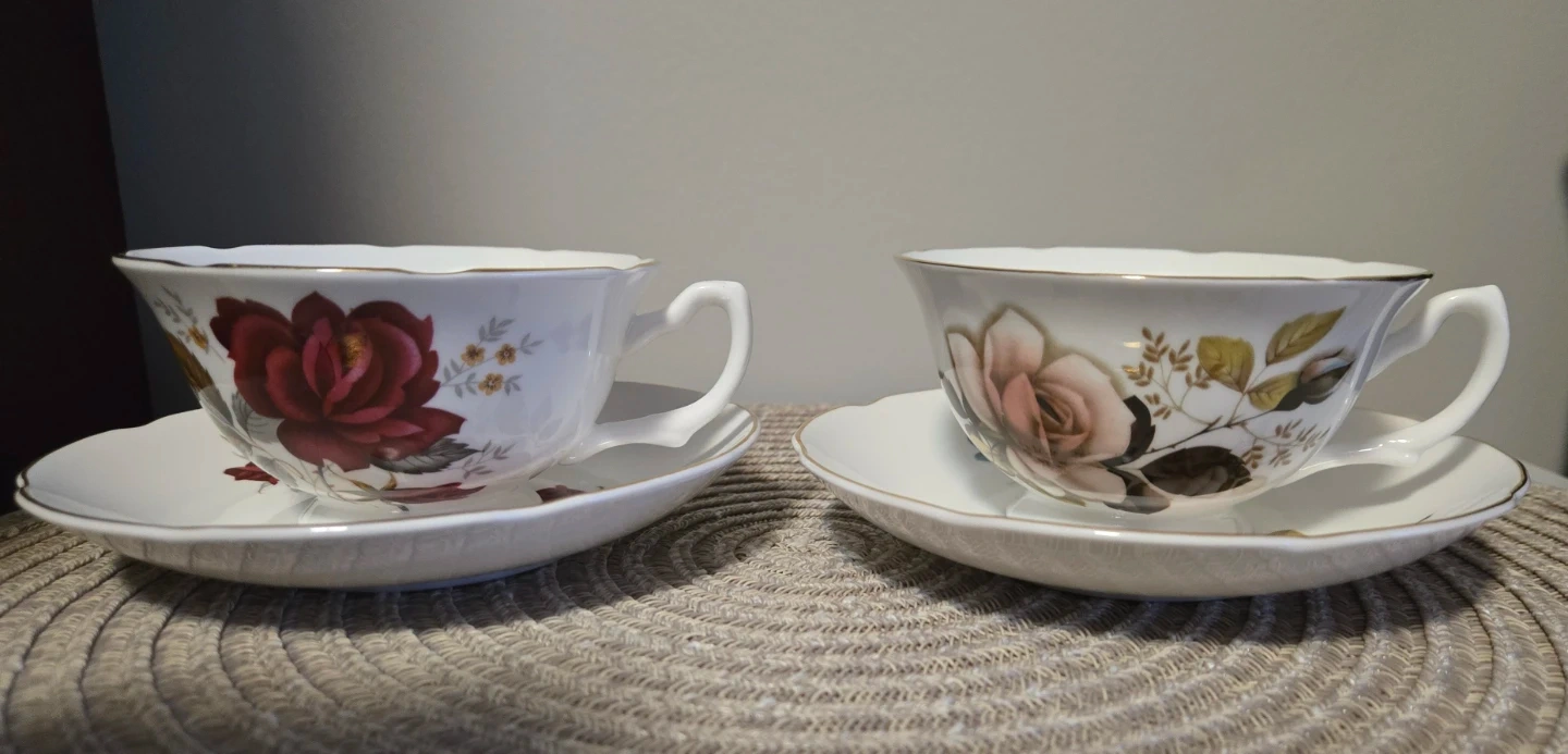 115Selling a lovely vintage Marlborough Bone China teacups and saucer sets! The teacups feature beautiful floral designs, one with a red rose and the other with a pink rose, both trimmed in 23 kt. gold. Both are in great condition, never used and ready to add a touch of elegance to your tea time