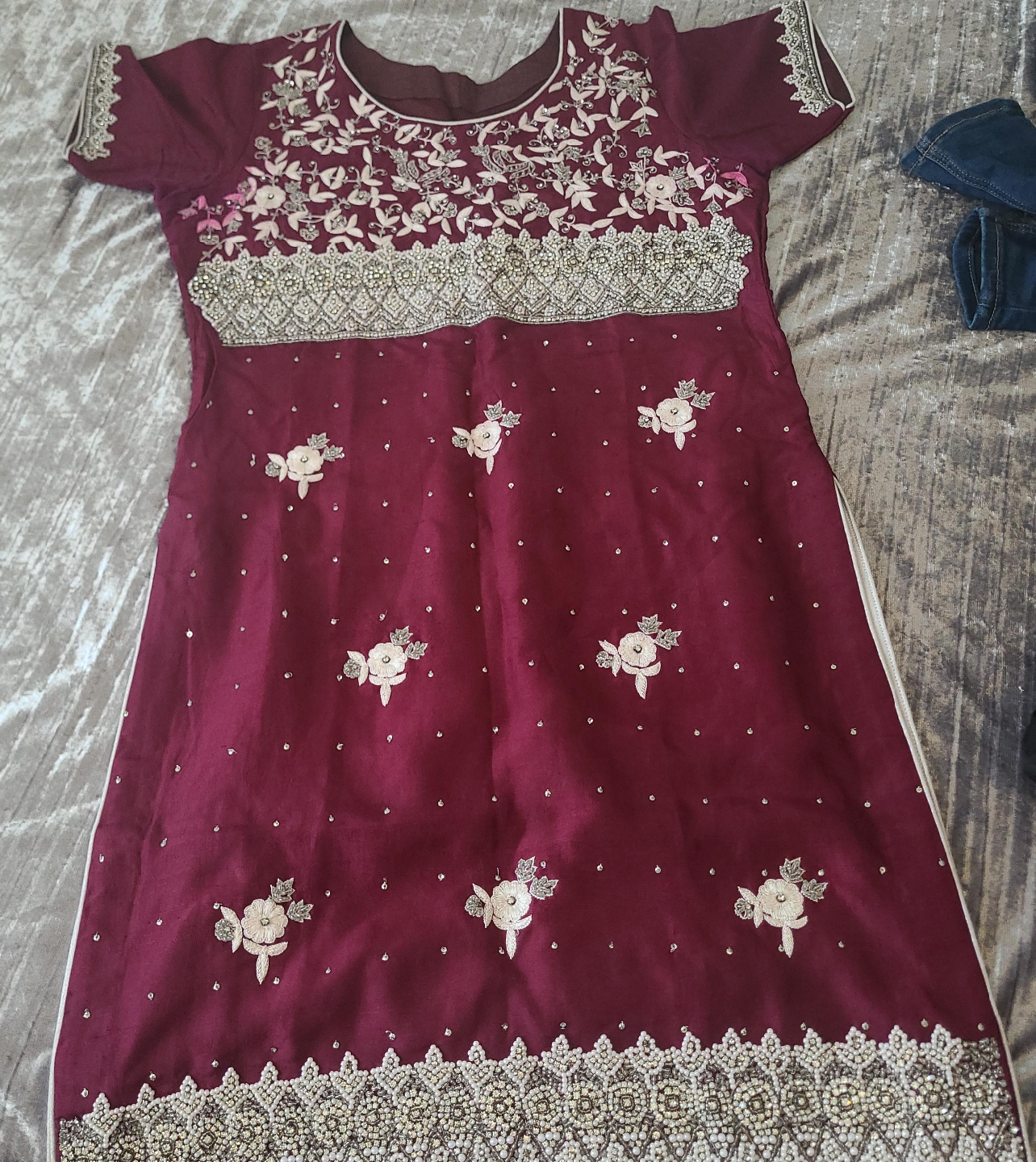 75Beautiful maroon kurti with intricate white embroidery and beadwork detailing! Perfect for a special occasion or just adding a touch of elegance to your everyday wear