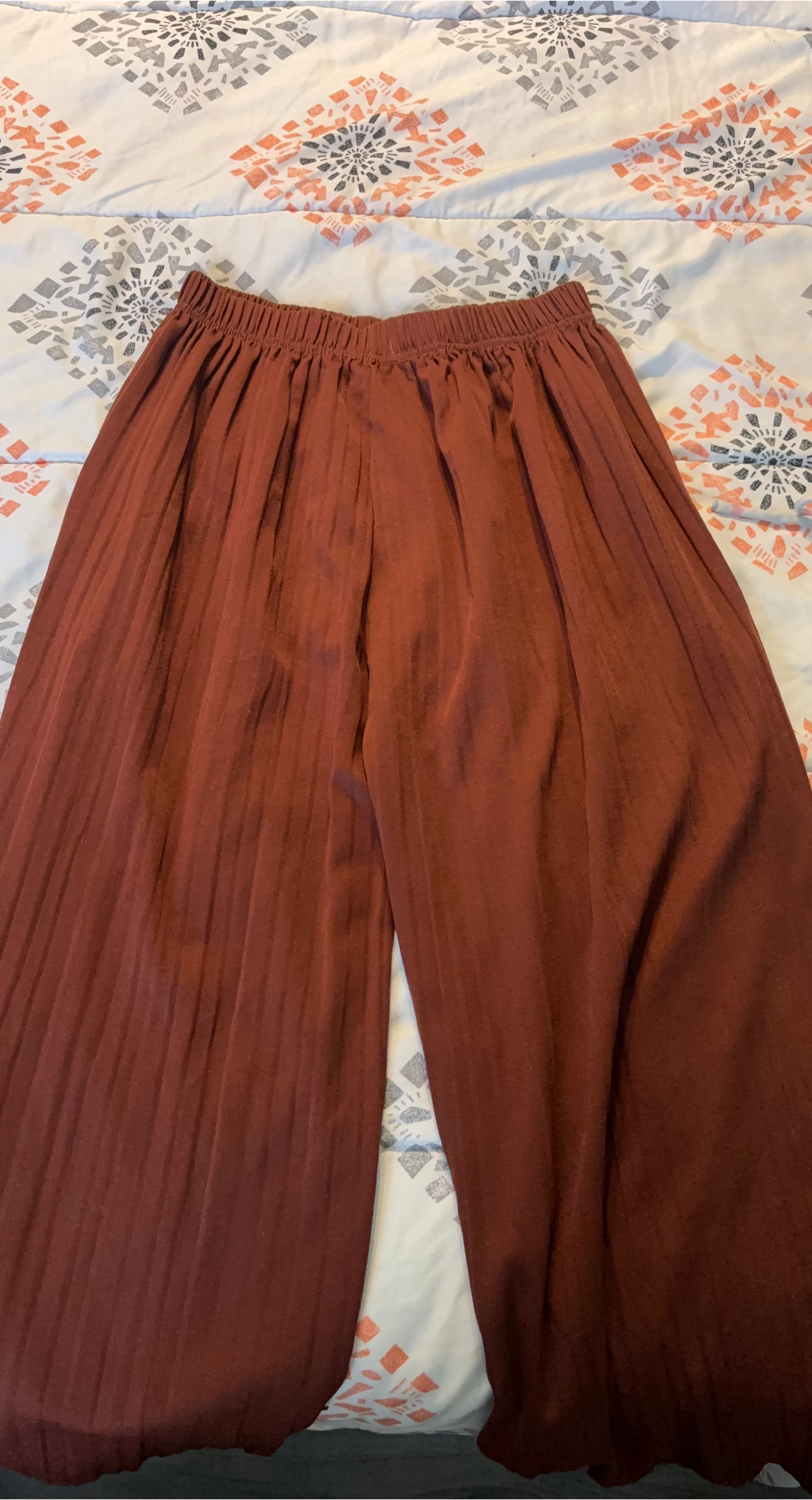 10Selling a pair of maroon wide-leg pleated pants! They have an elastic waistband for a comfortable fit. Perfect for a casual or dressy look