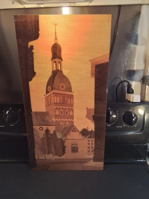 114Marquetry Wood Wall Art - Cityscape, USSR Beautiful marquetry wood art. Features a cityscape with a prominent church tower. Warm colour tones. Unique piece for home décor. Old town Riga, Latvia, made in USSR Measurements 22.5 x 12 Pickup at Young Street and Steels Ave