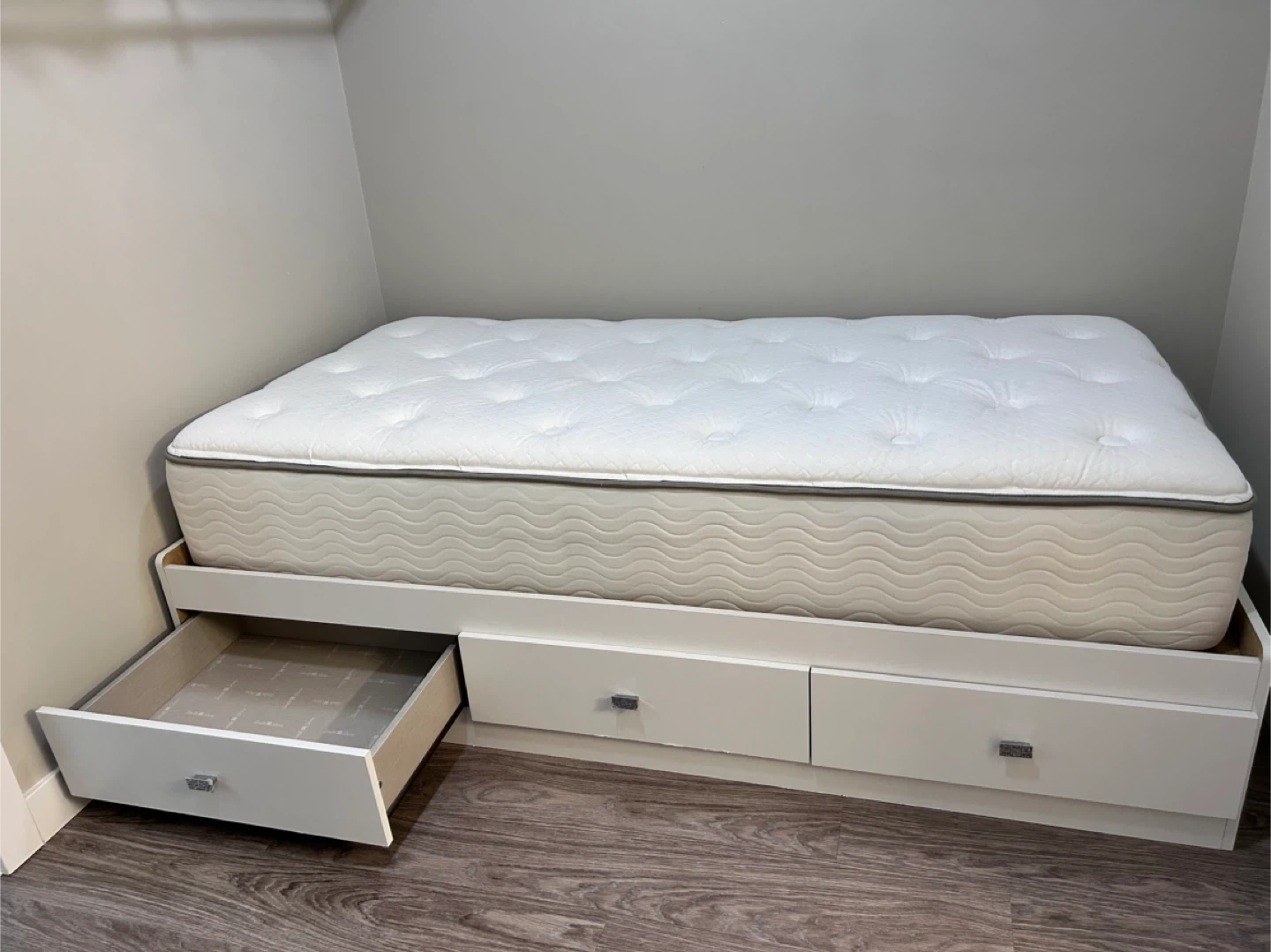 10Selling a Marriott mattress paired with a white bed frame! The mattress is exclusively made for Marriott and feels very comfortable. The bed frame is also in great condition and matches the mattress perfectly. It has drawers for extra storage
