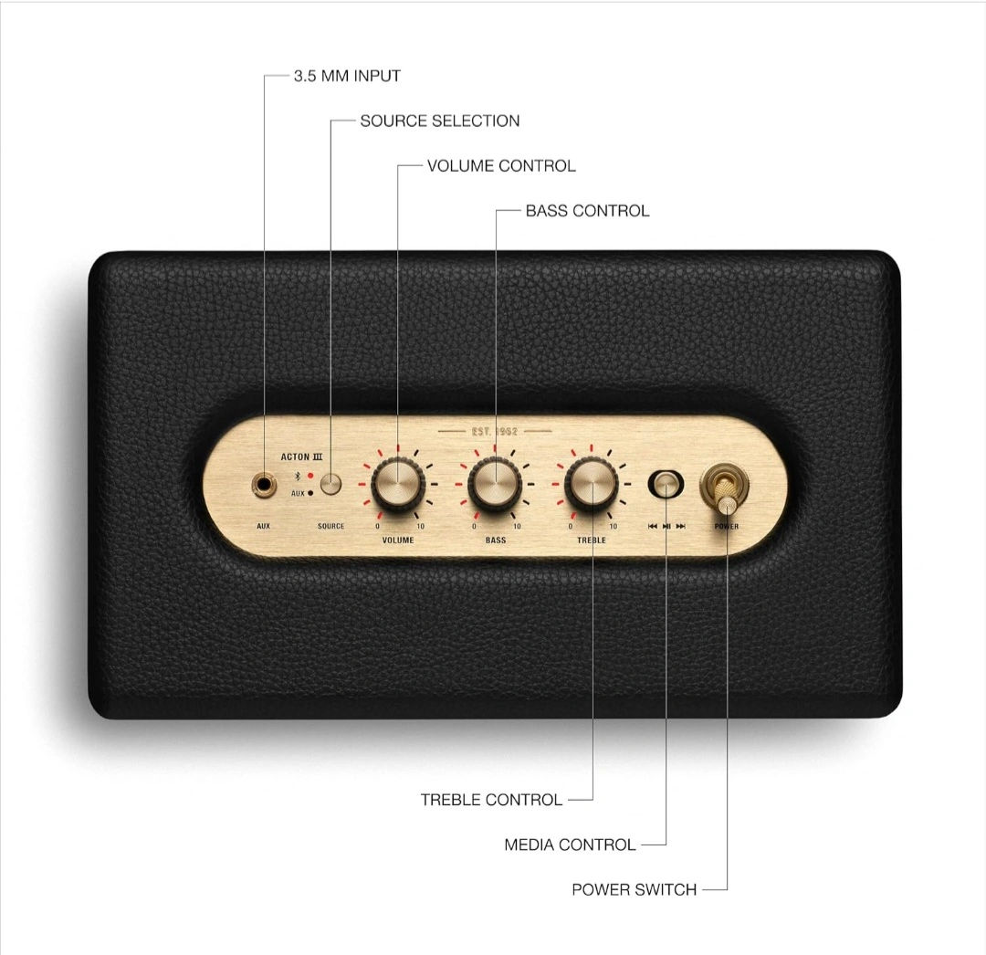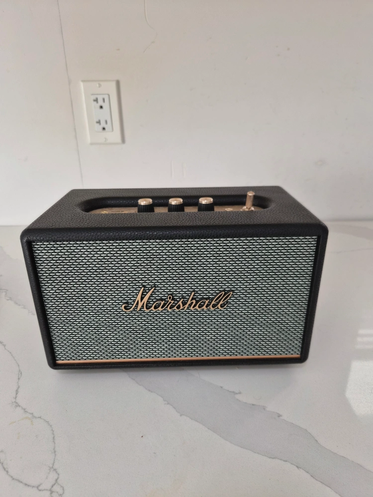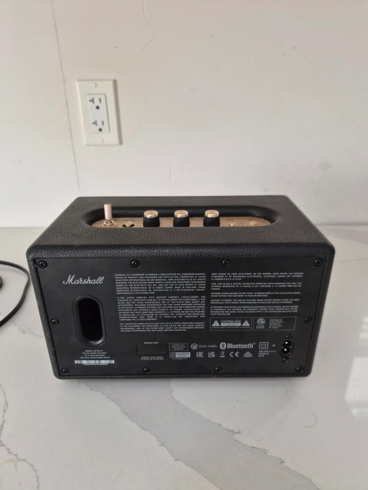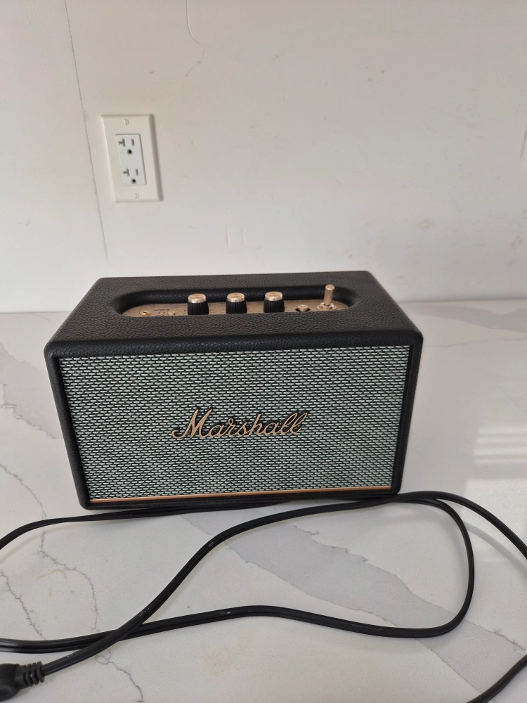 Selling a Marshall Acton III Bluetooth speaker! This speaker delivers powerful sound in a compact design. Perfect for any room in your home. It has a 3.5 mm input, source selection, volume control, bass control, treble control, media control and a power switch.