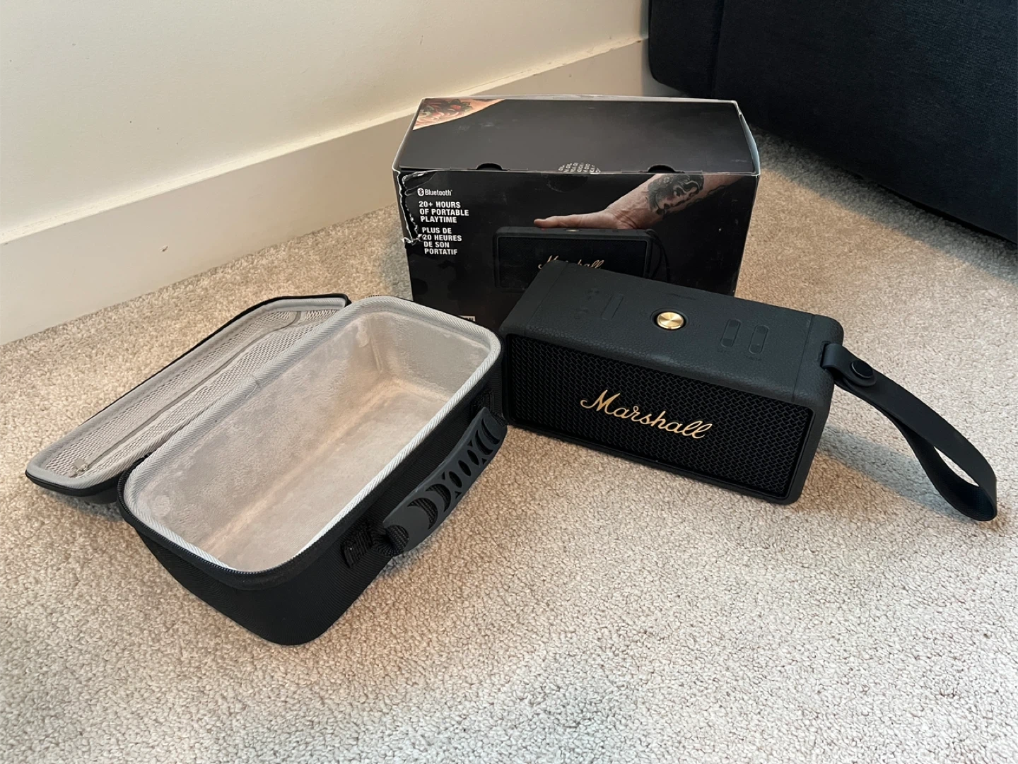 0Selling a Marshall Middleton portable Bluetooth speaker in black. It comes with its original box and a carrying case for easy portability. This speaker is designed for over 20 hours of portable playtime, perfect for on-the-go listening. It has Bluetooth connectivity and AUX input. Slightly used no scratches or damages