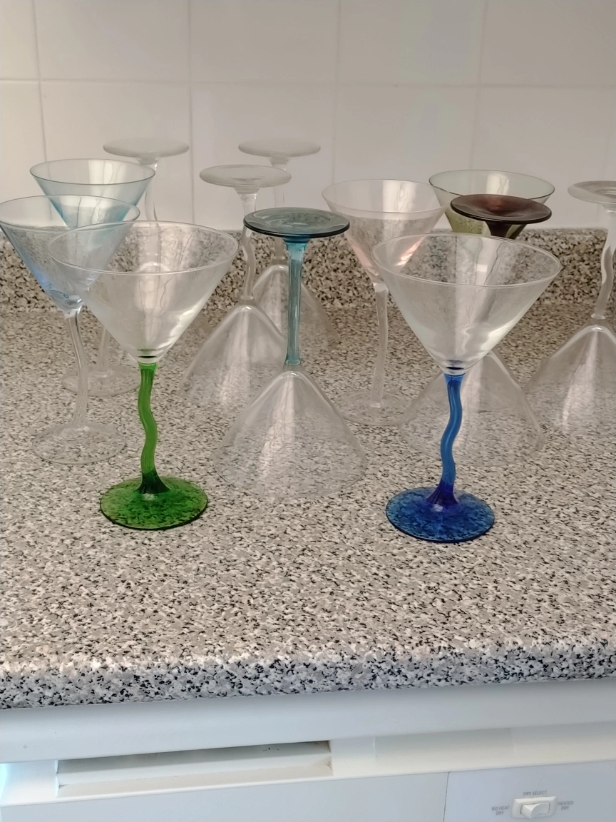 Selling a set of martini glasses with unique coloured stems! The stems are blue and green. They're in great condition and would be perfect for entertaining or adding a pop of colour to your home bar