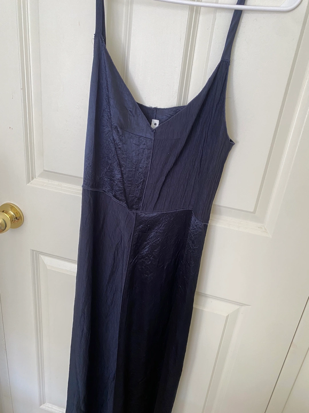 A navy blue slip dress with adjustable spaghetti straps. It features a V-neckline and a midi length. The fabric has a crinkled texture. This dress is suitable for evening wear.