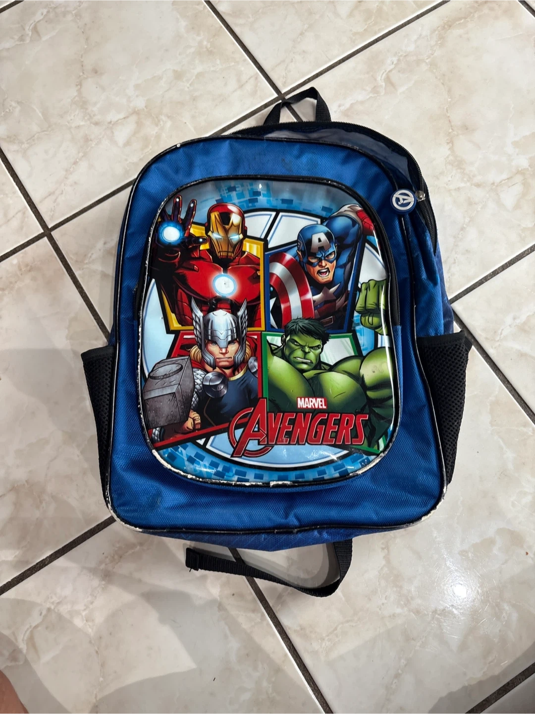 Here's a blue Marvel Avengers backpack! It features Iron Man, Captain America, Thor, and the Hulk. Perfect for any young Avengers fan