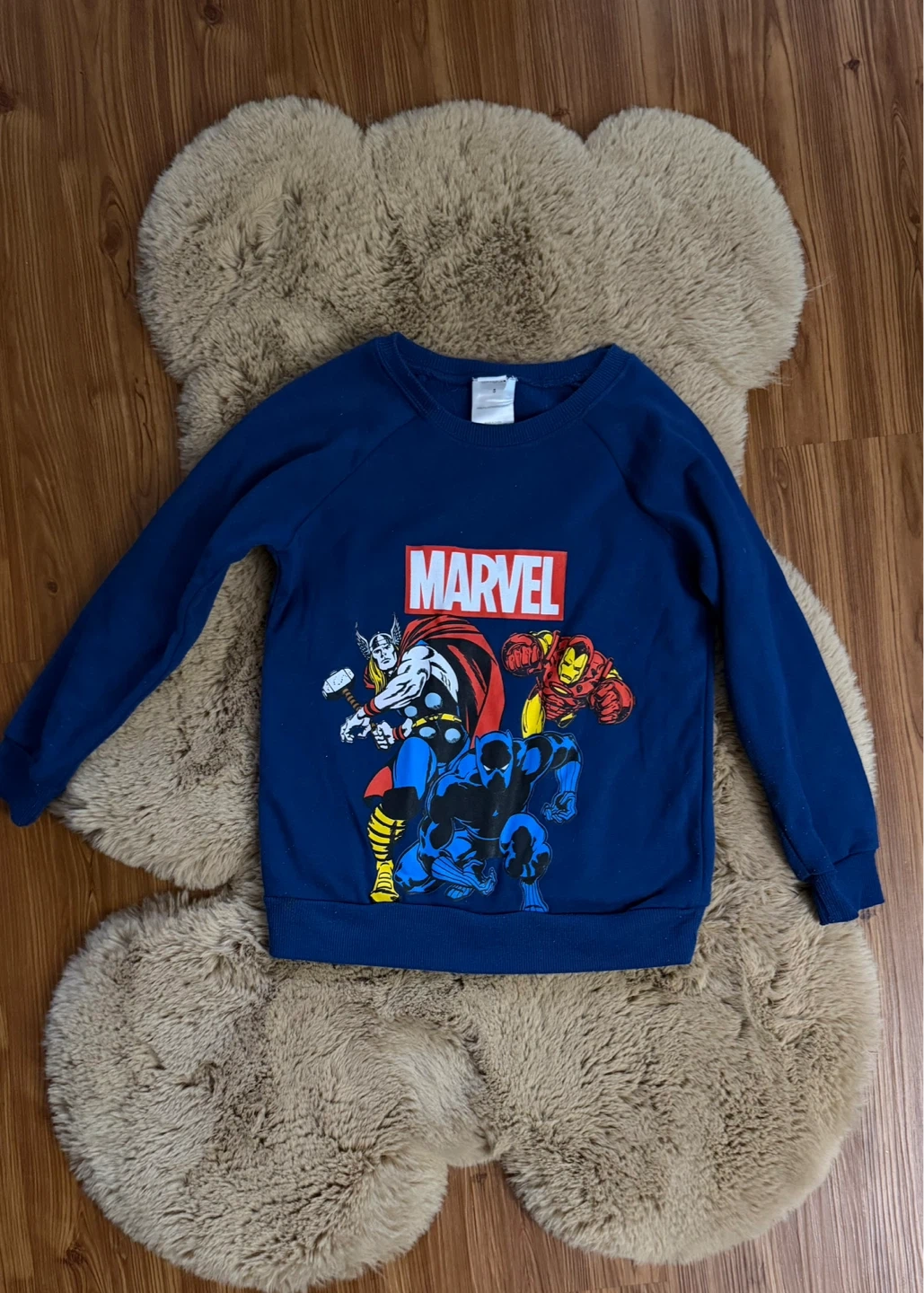 92This Marvel sweater is perfect for your little superhero fan. It features Thor, Iron Man, and Captain America on a navy blue background. The sweater is in good condition, ready for new adventures. * Brand: Marvel * Colour: Navy Blue * Character: Thor, Iron Man, Captain America If you see this ad, the sweater is still available! Only available for pick up